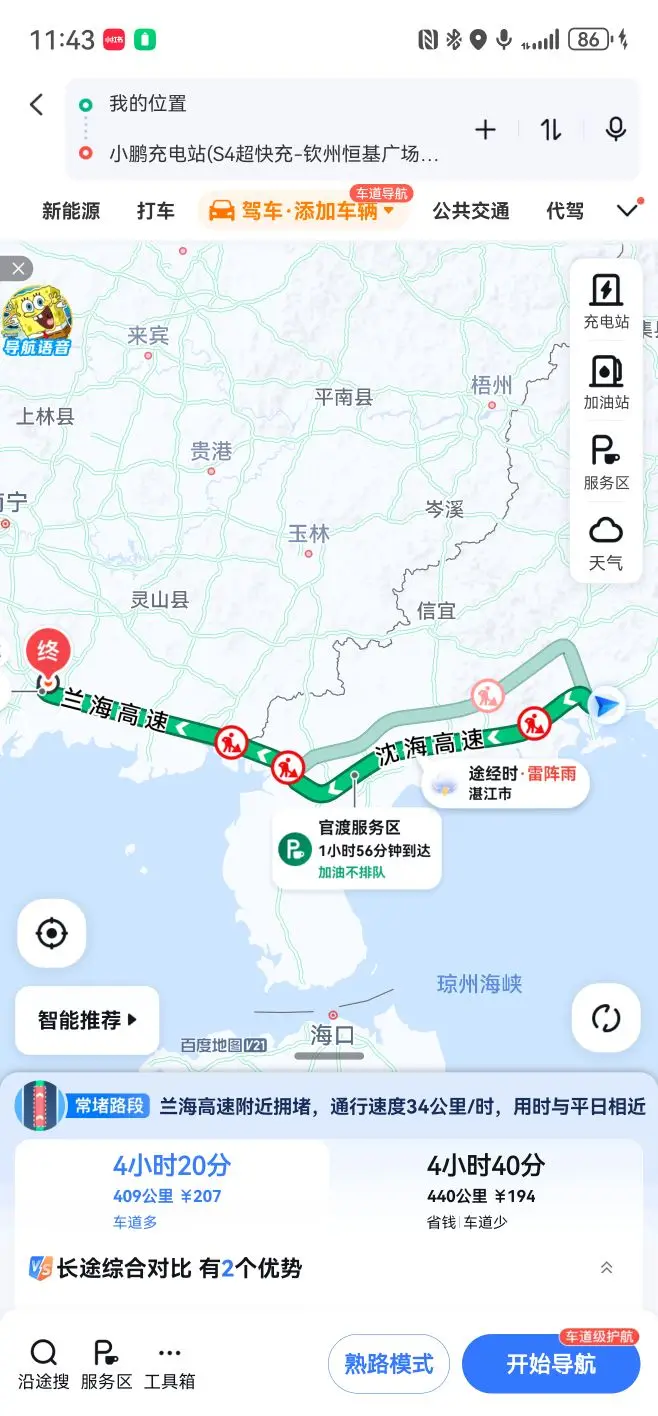 路线早已规划妥当:中途需补能一次,高速服务区的充电桩虽多,但买车时送的电卡可不能浪费,找小鹏超充站显然更划算。查得钦州刚好有个小鹏充电站,距出发点约409公里,在这里补能正合适,还能顺道钻进街边小店,嗦一碗酸辣够味的广西老友粉,给旅途添上几分地道烟火气。
