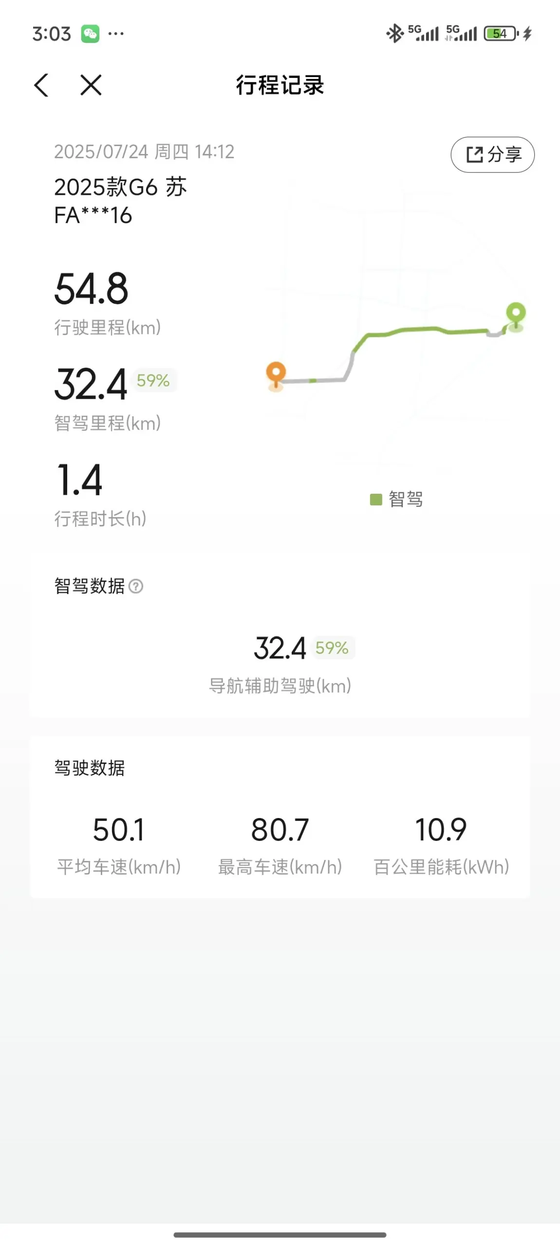 小P帮忙设置好导航就出发了,全程50多km,路上我打开NGP辅助驾驶,目前更新的5.7.5版本辅助驾驶可以自动进去左转待转区,也可以自行通过ETC,体验过后确实比原来版本功能更多了,路上以国道和省道为主,平均车速50km/h的情况下开出了10.9的电耗,G6的电耗控制水平真的不错!