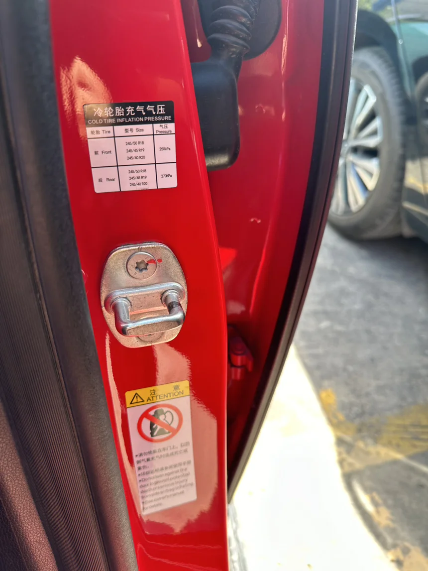 如果你不太确定自己的标准胎压是多少,可以看一下主驾驶车门内侧的胎压铭牌,上面会标注官方推荐值。