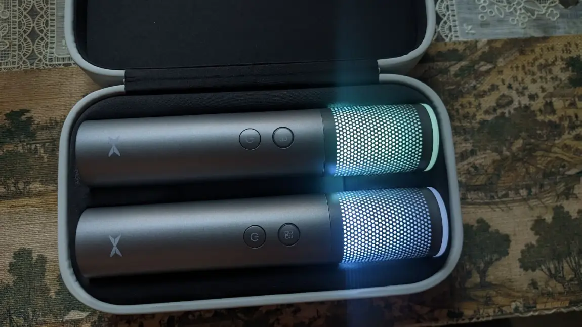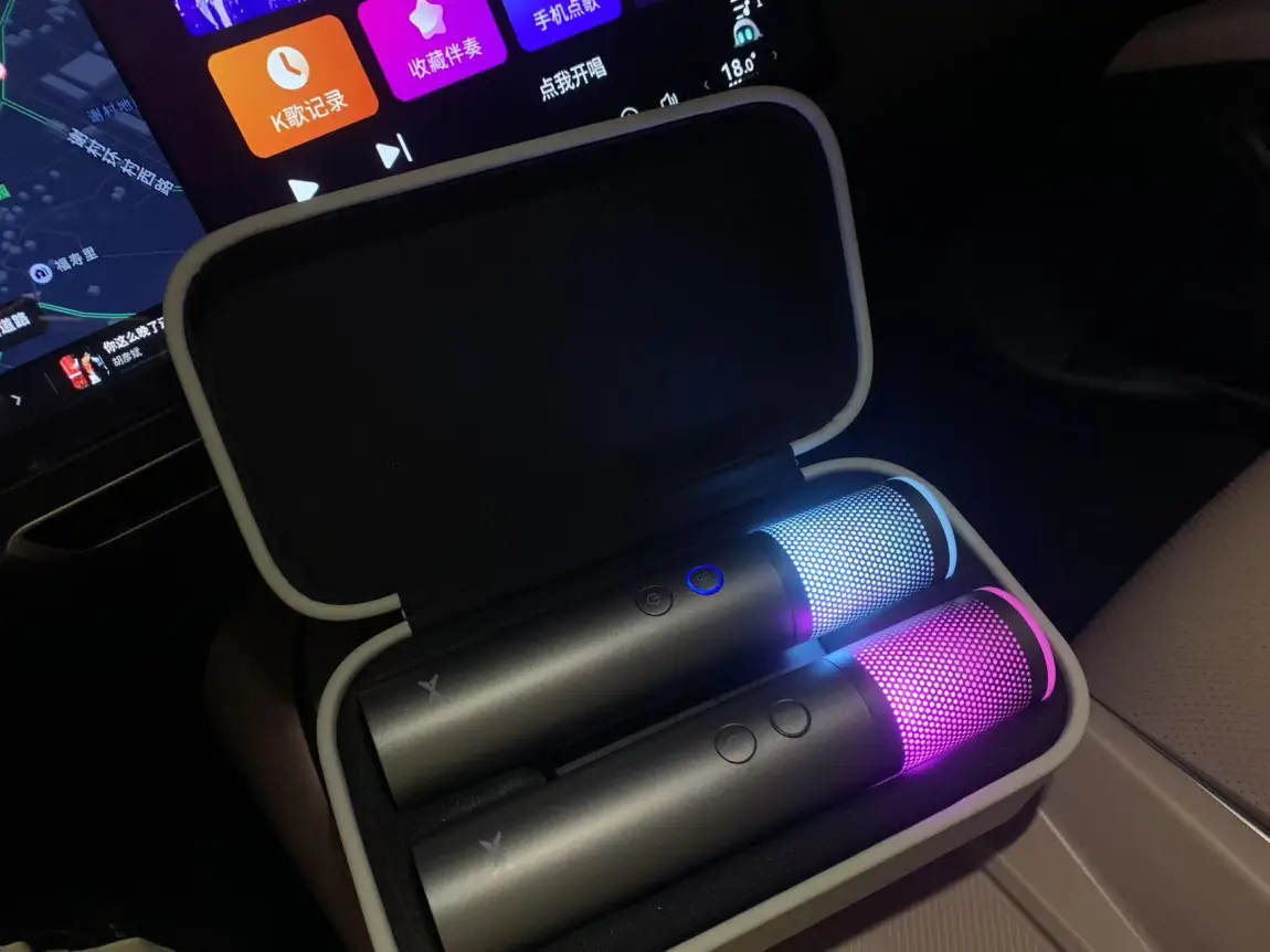 功能方面也挺方便,连车机特别快,插上车里的接口,按一下就接上了,唱歌时没延迟,跟车里的音响配合得挺好。音效模式也多,KTV那种、像演唱会似的,还有空灵、摇滚这些,换着用能唱出不同感觉,俩人一起唱也没问题,还能打分,挺有意思的。续航也够意思,充满电能唱10个小时,出去玩一路嗨唱都不用中途充电,偶尔还能当喊话器用,挺好玩。