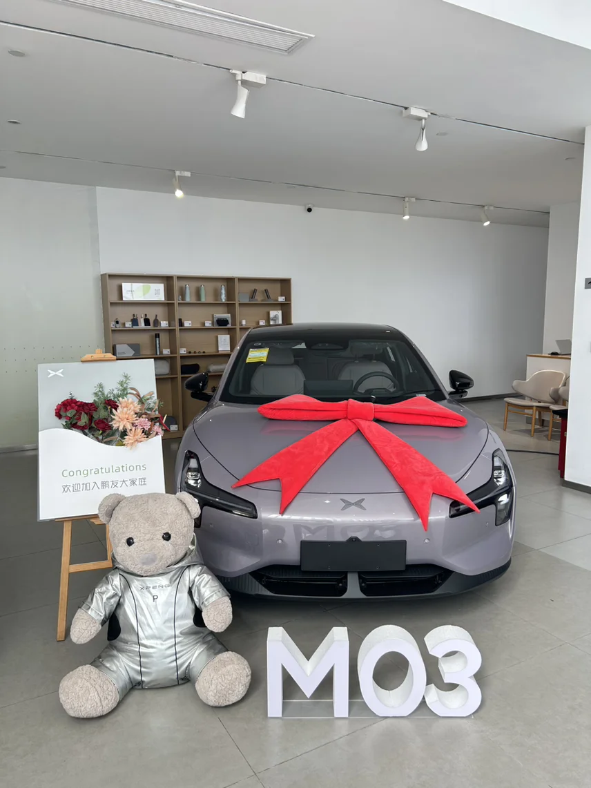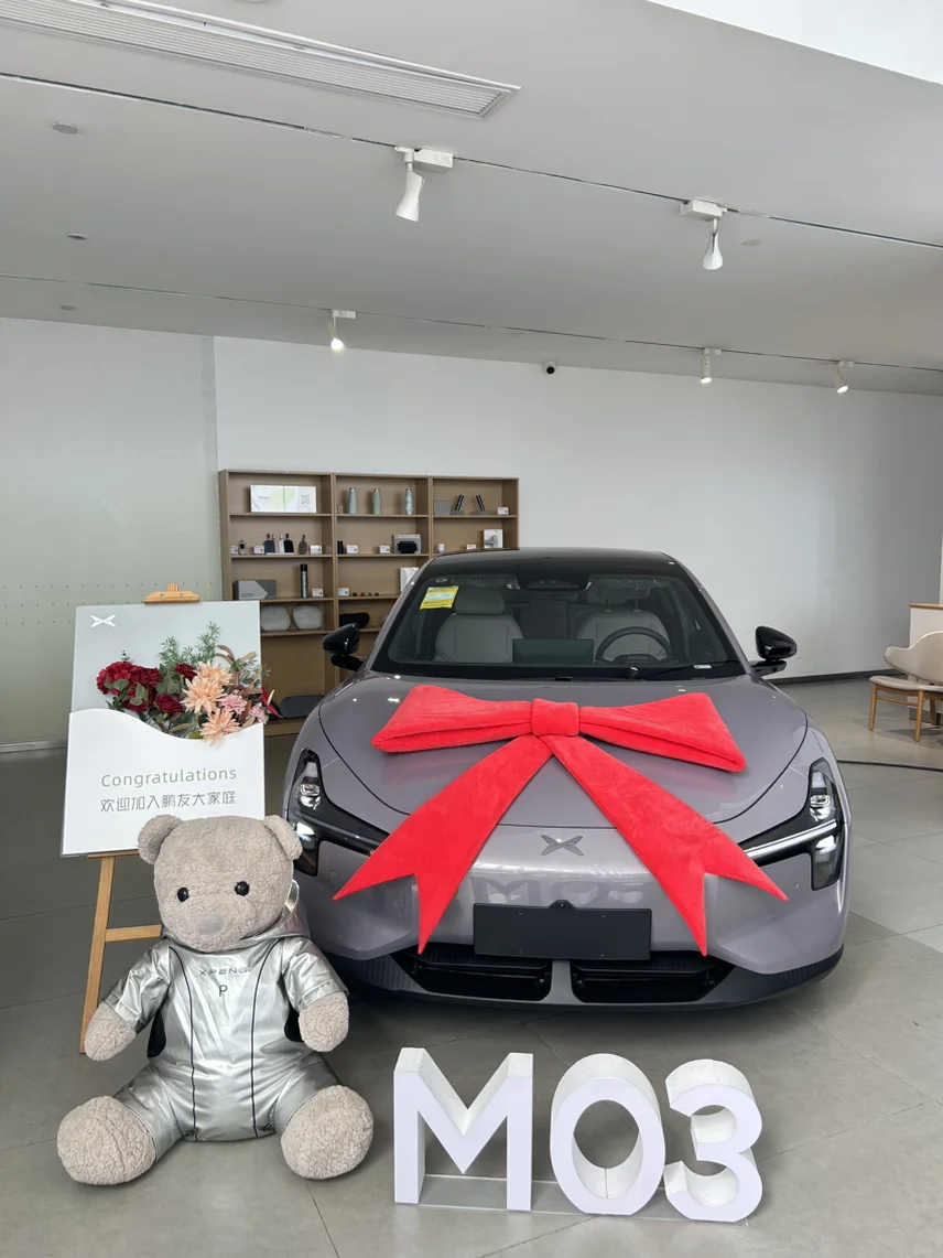 提车那天,交付中心的工作人员热情周到,不仅仔细帮我检查车辆,还耐心讲解各种功能。交车仪式上,收到了可爱的小鹏专属小熊,仪式感满满。开着新车上路,启动安静,加速顺滑,座椅通风加热,18扬声器音响带来沉浸式体验,太享受了!以后,就和我的小鹏M03一起探索更多美好啦~