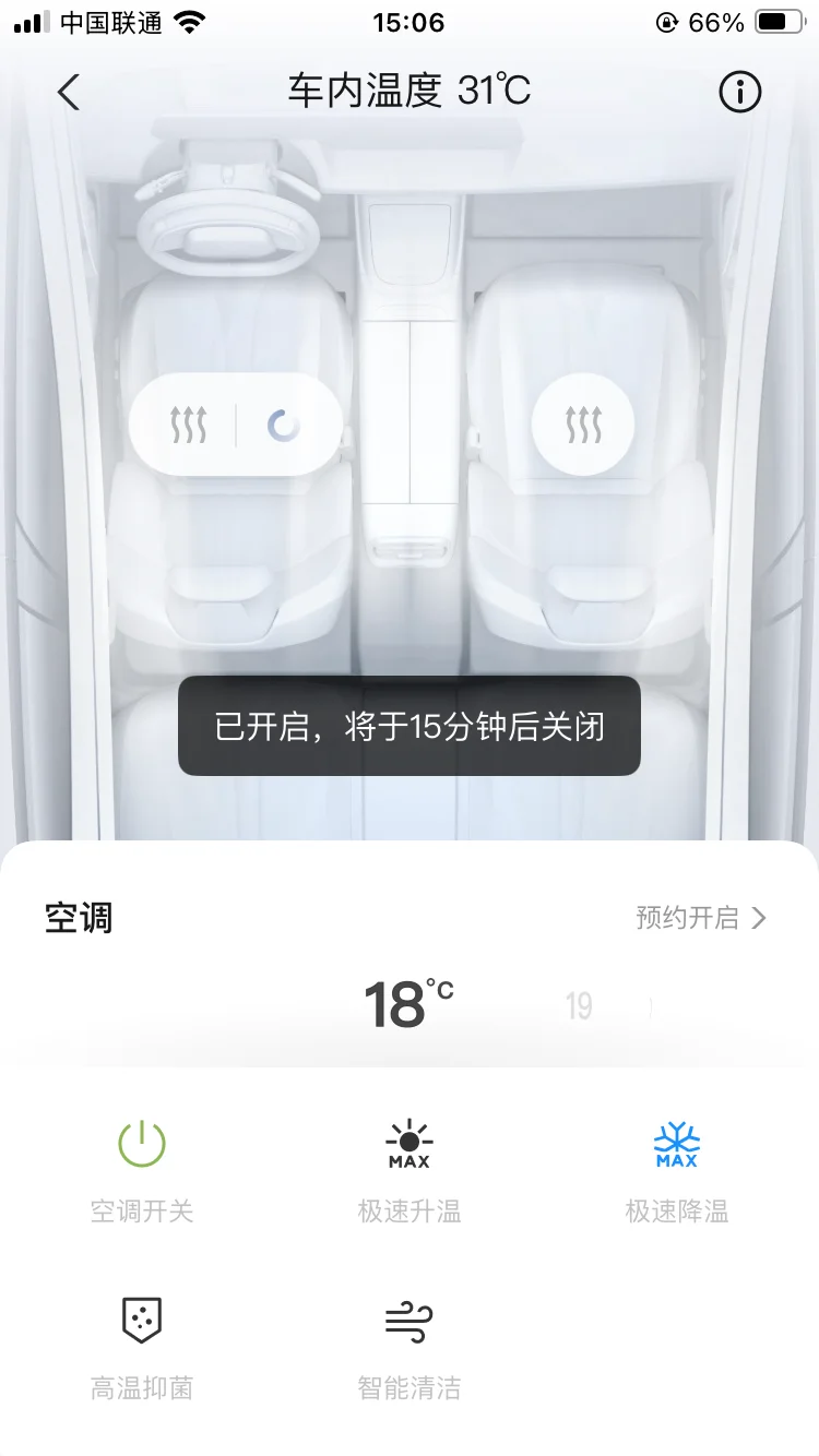 夏天的太阳像个大火球,车停在外面一会儿,车内就像蒸笼一样。这时候,提前用手机APP打开“极速降温”功能就非常必要。可以提前15分钟开启,等你上车时,温度就刚刚好。要是时间比较充裕,也能通过APP提前预约开空调。设置空调温度时,调到20度,风力3档,再打开内循环,这样制冷又快又省电。如果后排没人,记得把后排出风口关上,制冷效果会更好。