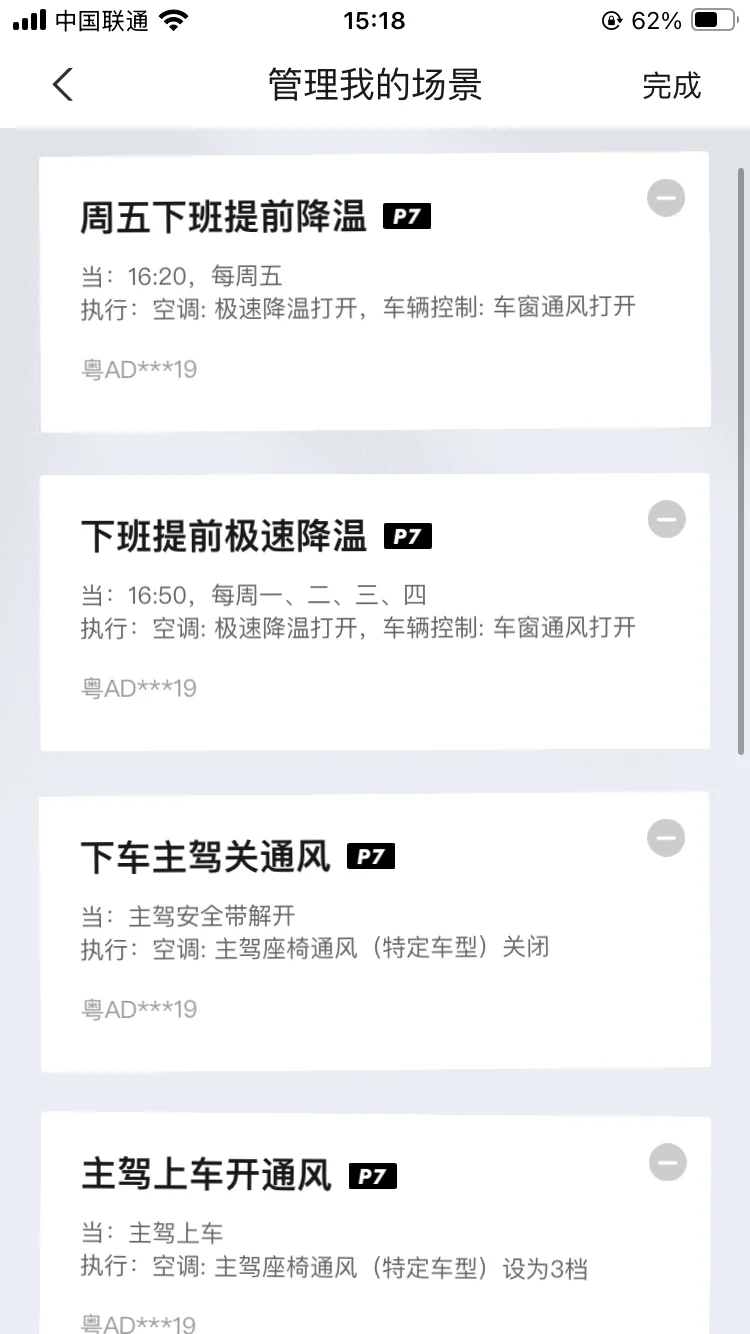 小鹏P7的车机里有很多实用的智慧场景,比如“智能极速降温”,当上车时车内温度超过35度就会自动开启;“太热时关闭无线充电”,能在温度过高时自动关闭无线充电,保护设备;“上车座椅要舒爽”,一上车就会打开座椅通风,超贴心。