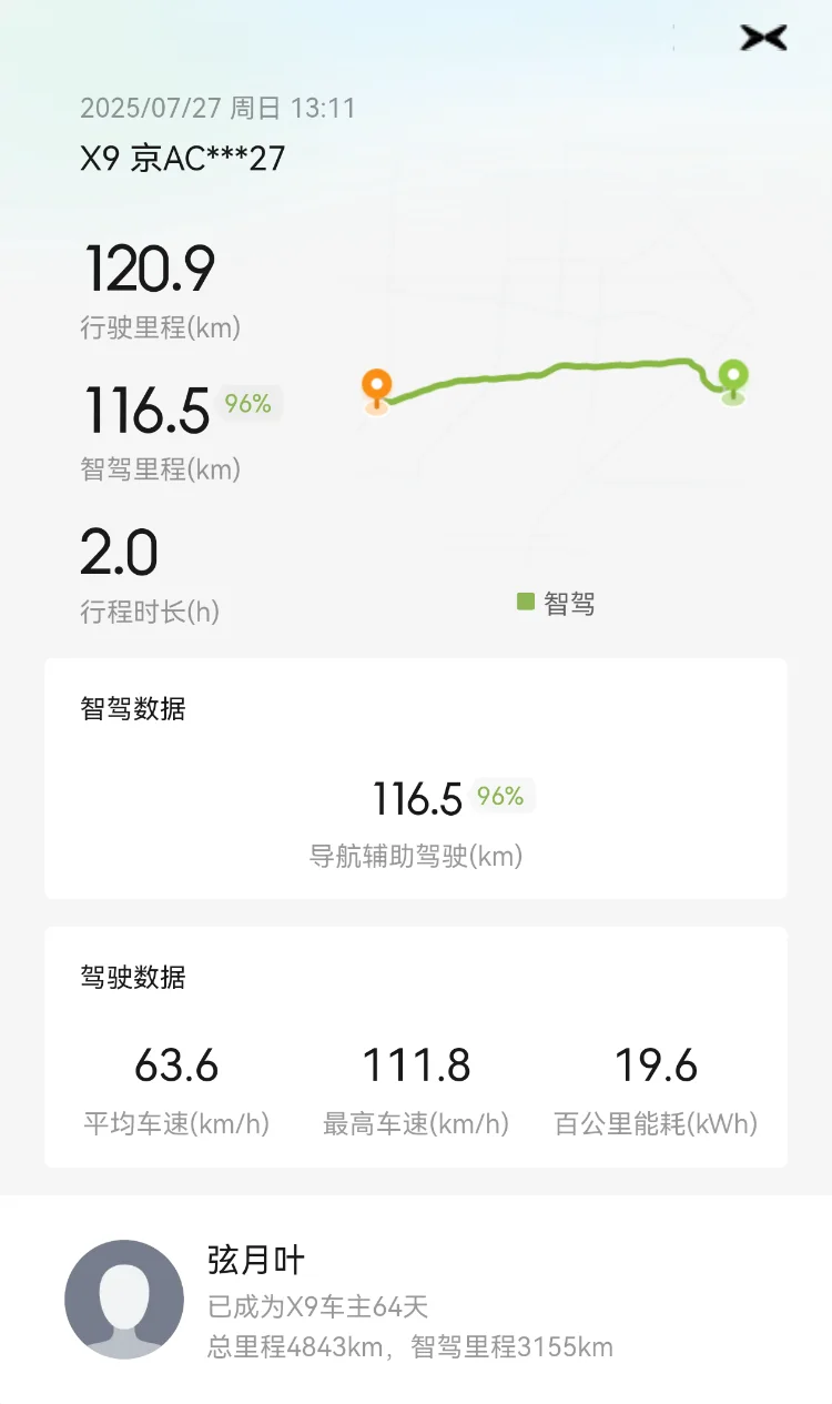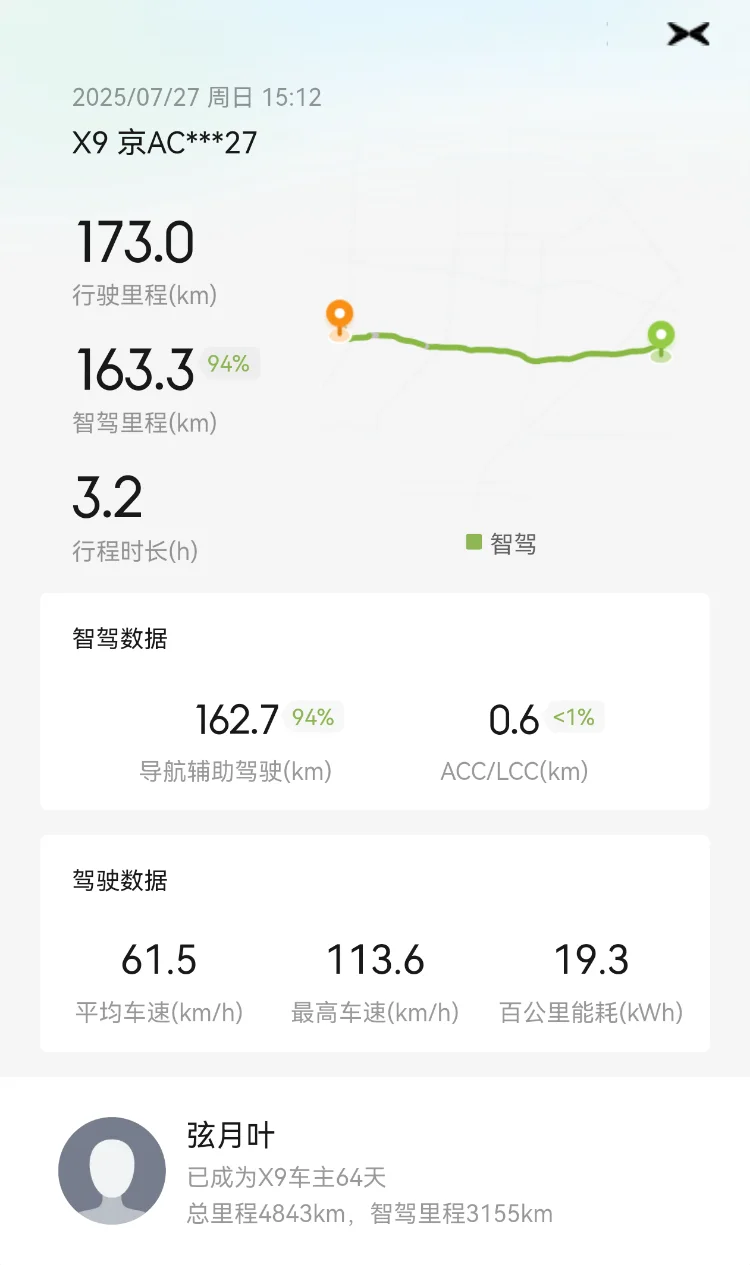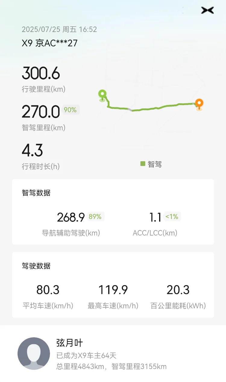 4.智驾:全程开启智驾,智驾比例超过90%。整体表现不错,司机驾驶精力可以节省不少。往返途中,智驾各被大雨浇灭一次,提示退出接管。目测当时路况已经看不清了,不知道激光雷达会不会效果更好一点,不过那种情况最好还是手动驾驶。另外,不知道是不是打开双闪就不能启动智驾了,去程的时侯雨势见小重启智驾一直打不开,关闭双闪后就可以了。个人感觉视觉智驾可以满足日常用车需求,提车2个月,开了5000公里,智驾近70%,车子智驾表现越来越好,快速路、环路、高速表现越来越合理,上下班ai路线可以顺利过小区停车杆和高速收费站。