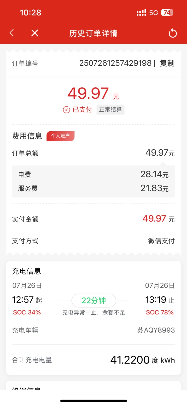 到老家找了个中石化120kw快充桩补能,充了50块钱居然跑满功率,十几分钟就提示余额不足断充了,第一次体验这种“扣扣搜搜”的充电方式,突然懂了为什么开电车会让人变抠门——毕竟家里充电桩才3毛一度,外面快充要1块2,这差价看一眼都肉疼啊!