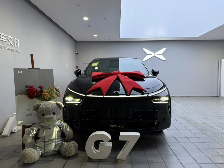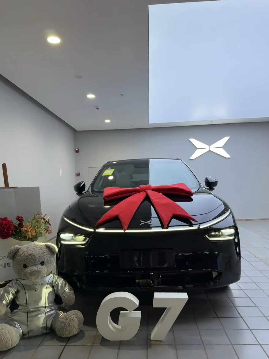 #我的提车作业# 终于等到你-小鹏G7,对比了好多车型,最后选择了小鹏!提车当天的天气很好,黑色车企非常得帅气,在阳光下很有质感!抽到了和大师兄同款小熊。今天的交付流程十分顺畅,车辆空间很大,语音助手十分给力,标配按摩,智驾,可以有效得缓解开车疲劳,也会推荐给亲戚朋友的哈#小鹏提车 #小鹏G7首批车主火热提车!@何小鹏