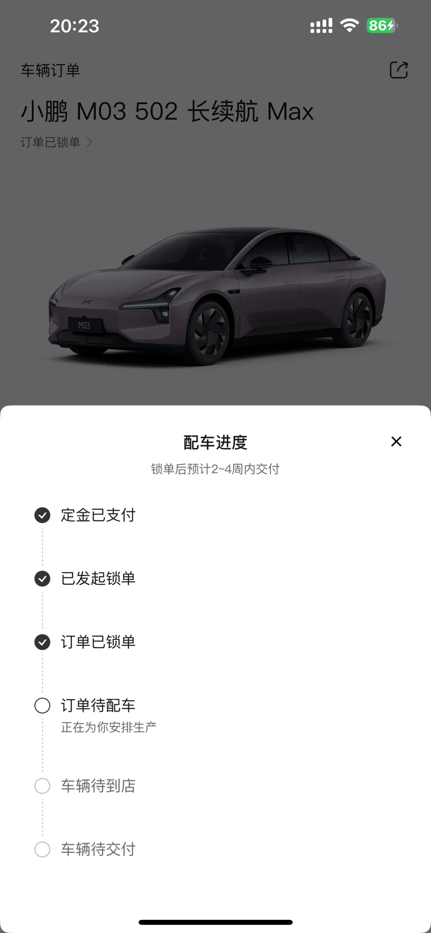#我的提车作业# 小鹏M03|新车落地 顺顺利利🥳终于提车啦!!!小紫越看越喜欢!智驾比我开车还猛,有点不适应试了下就关了。自动泊车超好用,这两次停车都是小p停的相当规范,美滋滋~从4s店开回家了!可能有点不适应急刹给自己开的有点晕哈哈。7.27下定的,恨不得马上配车提车,每天都度日如年的哈哈哈哈,8.2就收到配车消息了!还是相当快的,然后8.5车就到店啦,昨天去提的!越看越喜欢,颜值超高诶!昨天还马上更新了系统哈哈哈。