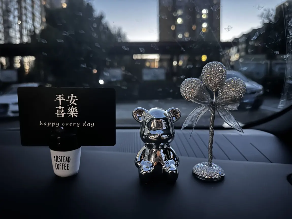 单位活动做的香包,带着淡淡的艾草香,被我挂在了出风口,风一吹就晃晃悠悠;单位的免费充电福利,给我的小车车充满动力;特意挑的紫色小蝴蝶,停在中控上,成了车里的小点缀;后排的小熊永远乖乖坐着,像个沉默的伙伴,陪我走过每一段路。闺蜜送的挪车电话牌也一直陪着我❤️