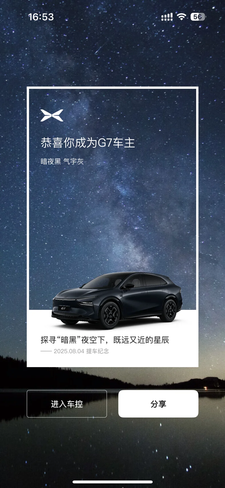 家里是p7老车主考虑买一辆suv,之前看过新款小鹏g6也很满意但是座椅配置还想提高一点,g7一上市各方面的配置都让我惊喜满满,一抽出空来马上就到门店去试驾了小鹏g7,试驾当天就锁单等待提车了!提车当天交付服务流程很丝滑,还给我们准备了午饭,在交付中心验了车的外观内饰,交付同学介绍了用车功能和注意事项,在交付中心的车管所注册好拿到临牌就出发海南啦!