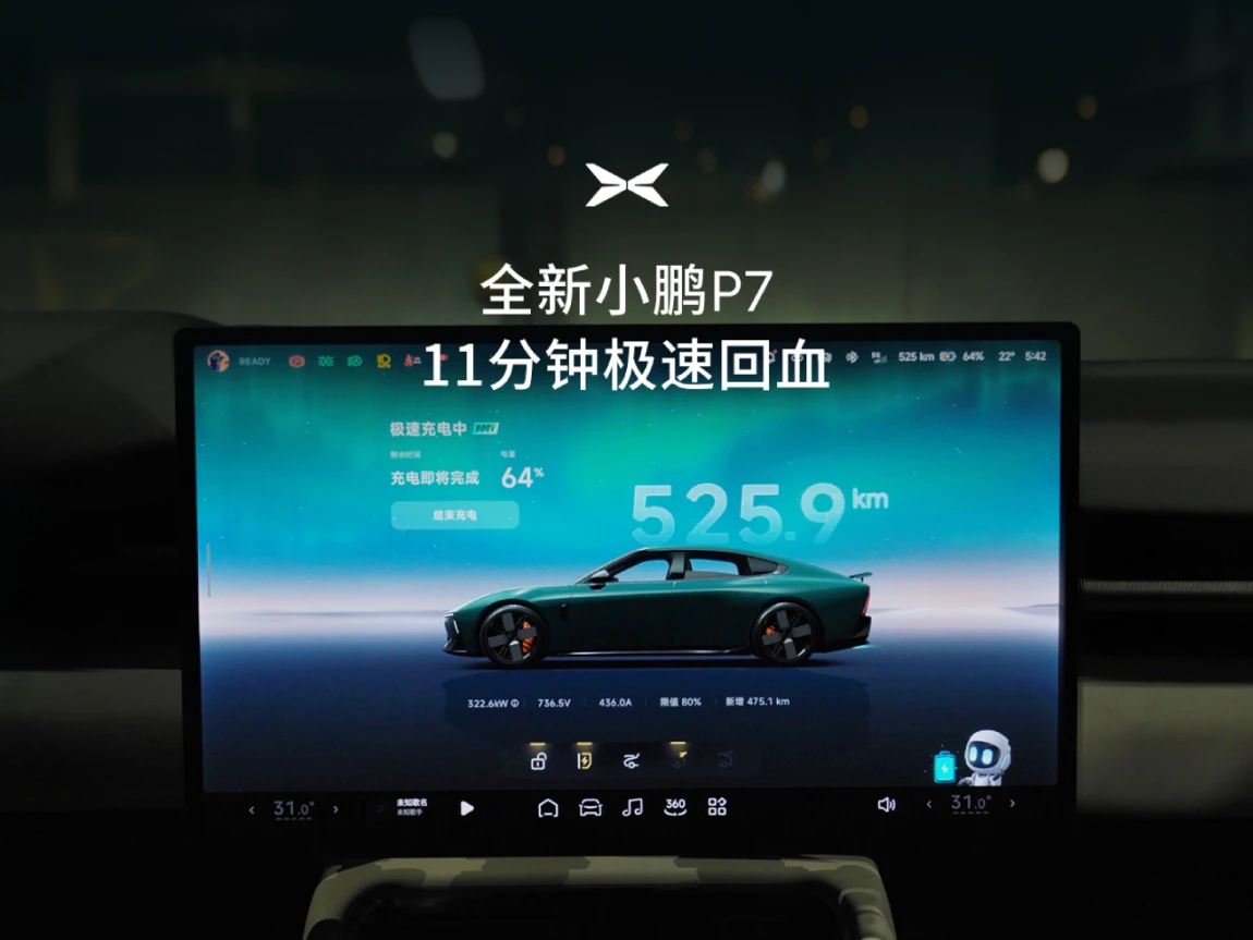全新小鹏P7的充电速度能有多快,充电10分钟,续航增加525公里,1 秒不止 1 公里。