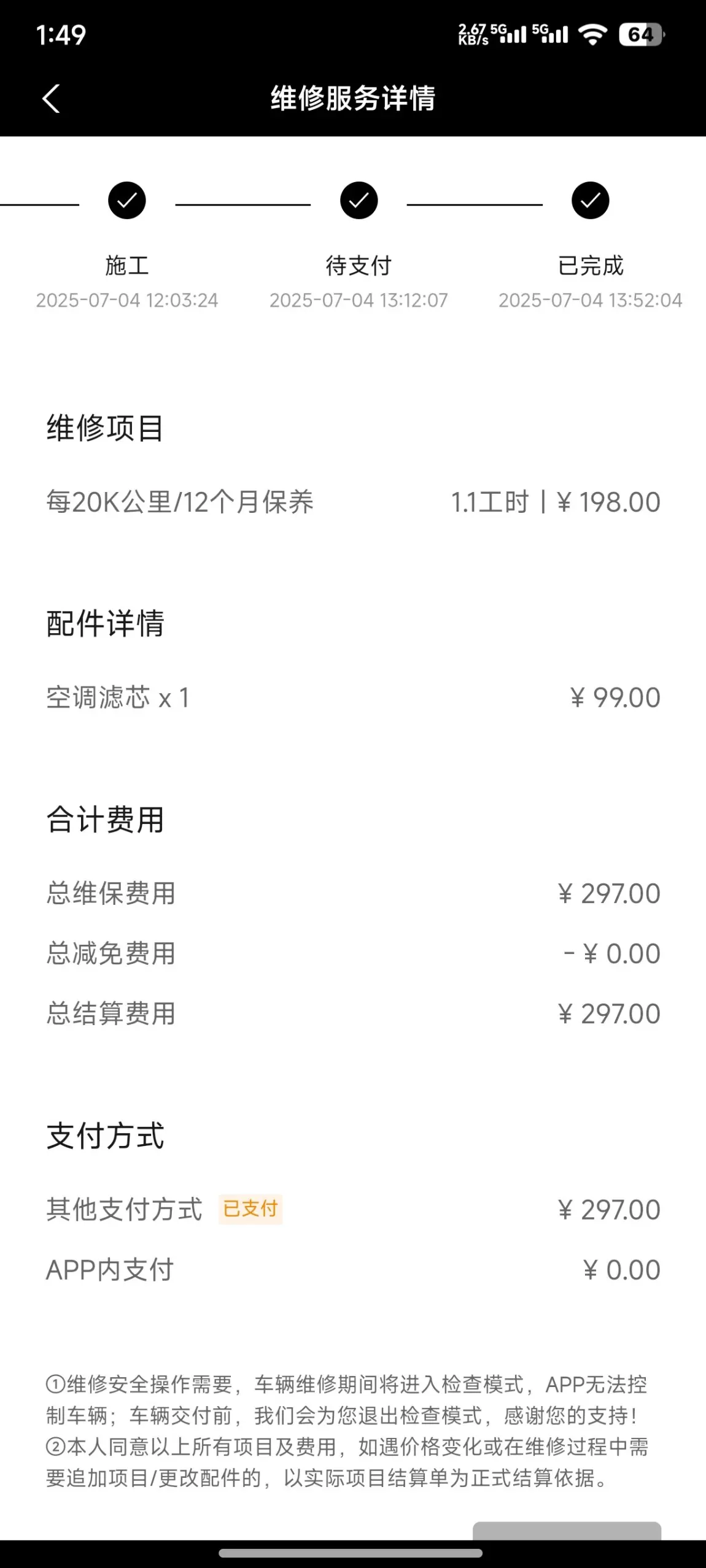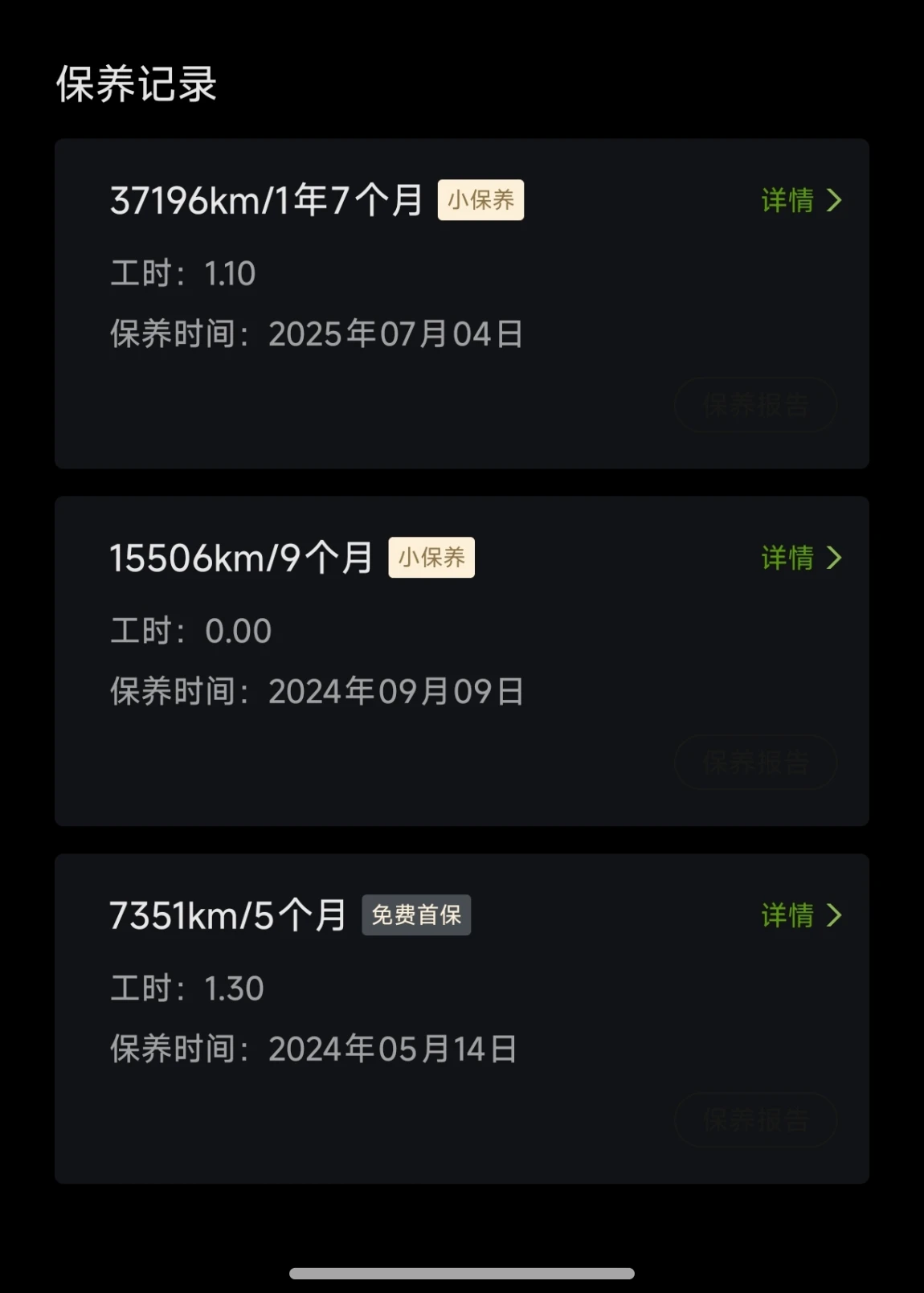 而保养费用同样让我满意。这 19 个月里,我保养了两次,总共花费 602 元。小鹏鸡柳首保在 5000 公里或 6 个月,之后每 10000 公里保养一次。首保免费,第二次保养更换空调滤芯、检查三电系统等,花费 350 元。