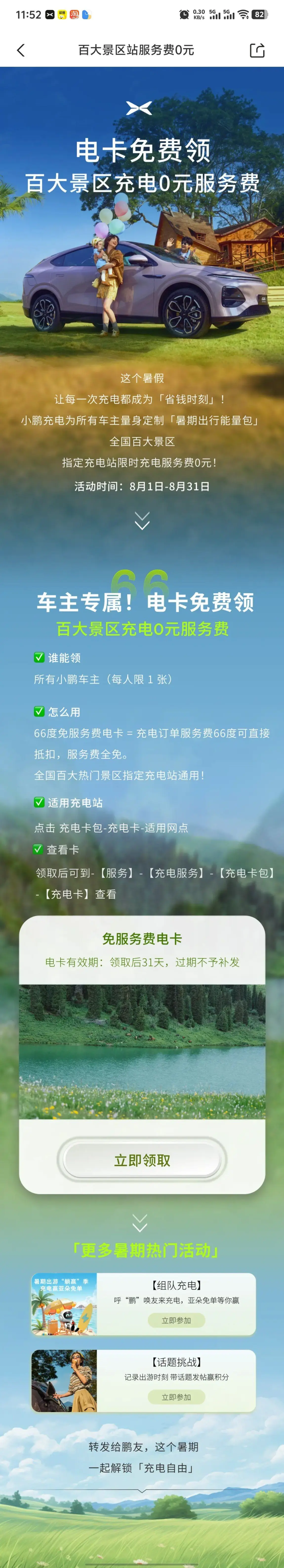 - 小鹏车主可以在小鹏汽车APP上领取一张66度免服务费的电卡,适用于全国100多个热门游乐场周边的自营站和合作场站。