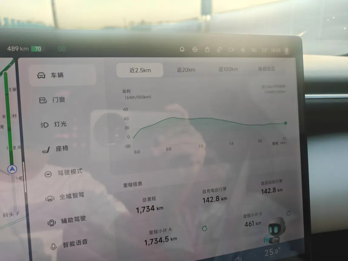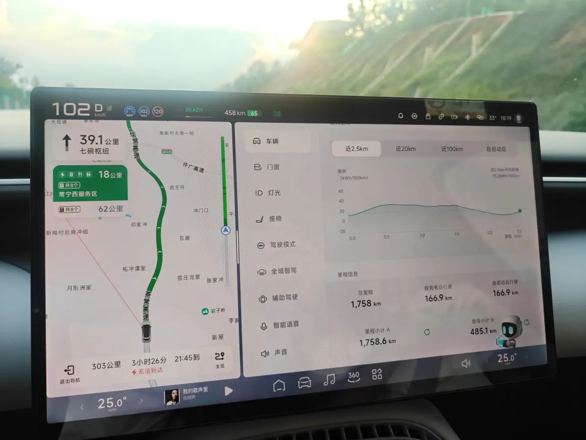 前半程我开启了是节能模式,关闭了悬架调教,cltc满电702km,路上导航速度我基本是100-115左右。实际上我开350多公里的时候,只剩下33%的电,350/0.67=522 反推一下,开到趴窝大概就520多的续航,七折出头。
