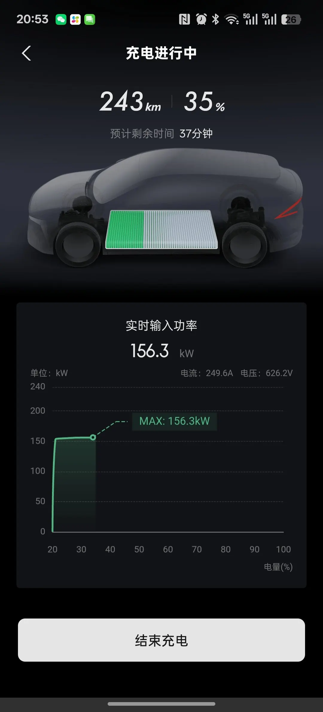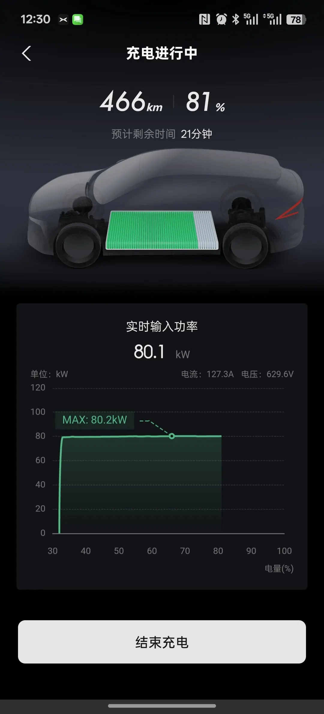 充电的时候我也问了其他的车主,小鹏g7的补能效率,算快的。路上遇到一辆汉,它充电只有40 千瓦,我居然是120几。我和他都惊呆了。还有一辆bba的第一个B,同样的桩他就30到40的充电功率,我156😂