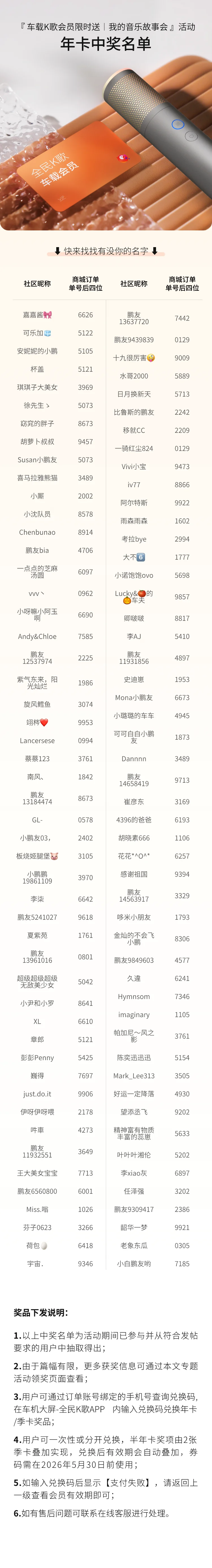 1.用户可通过订单账号绑定的手机号查询兑换码,在车机大屏-全民K歌APP内输入兑换码兑换年卡/季卡奖品;