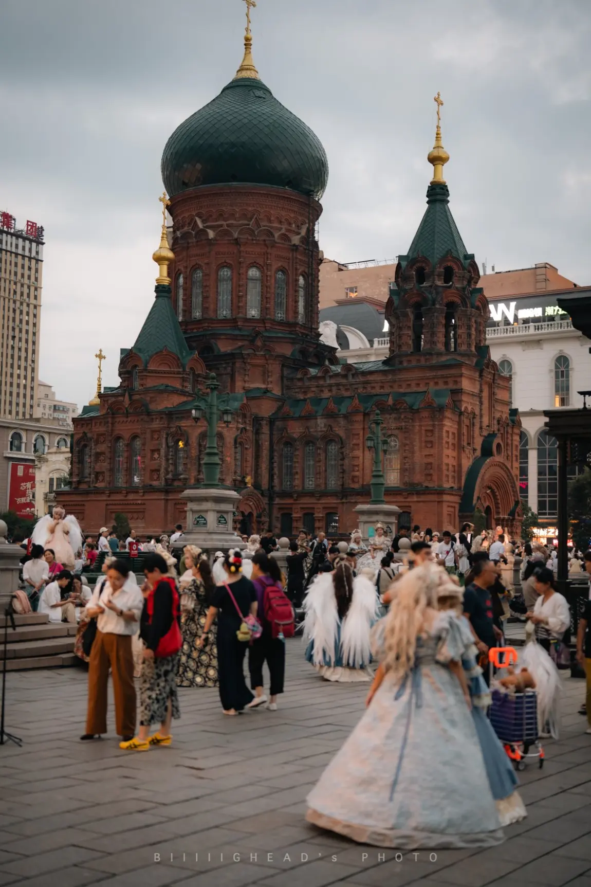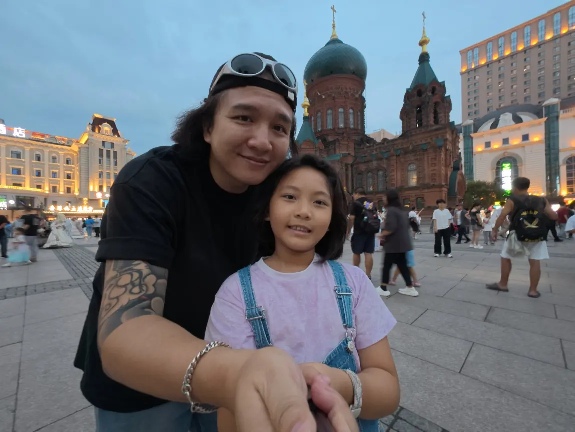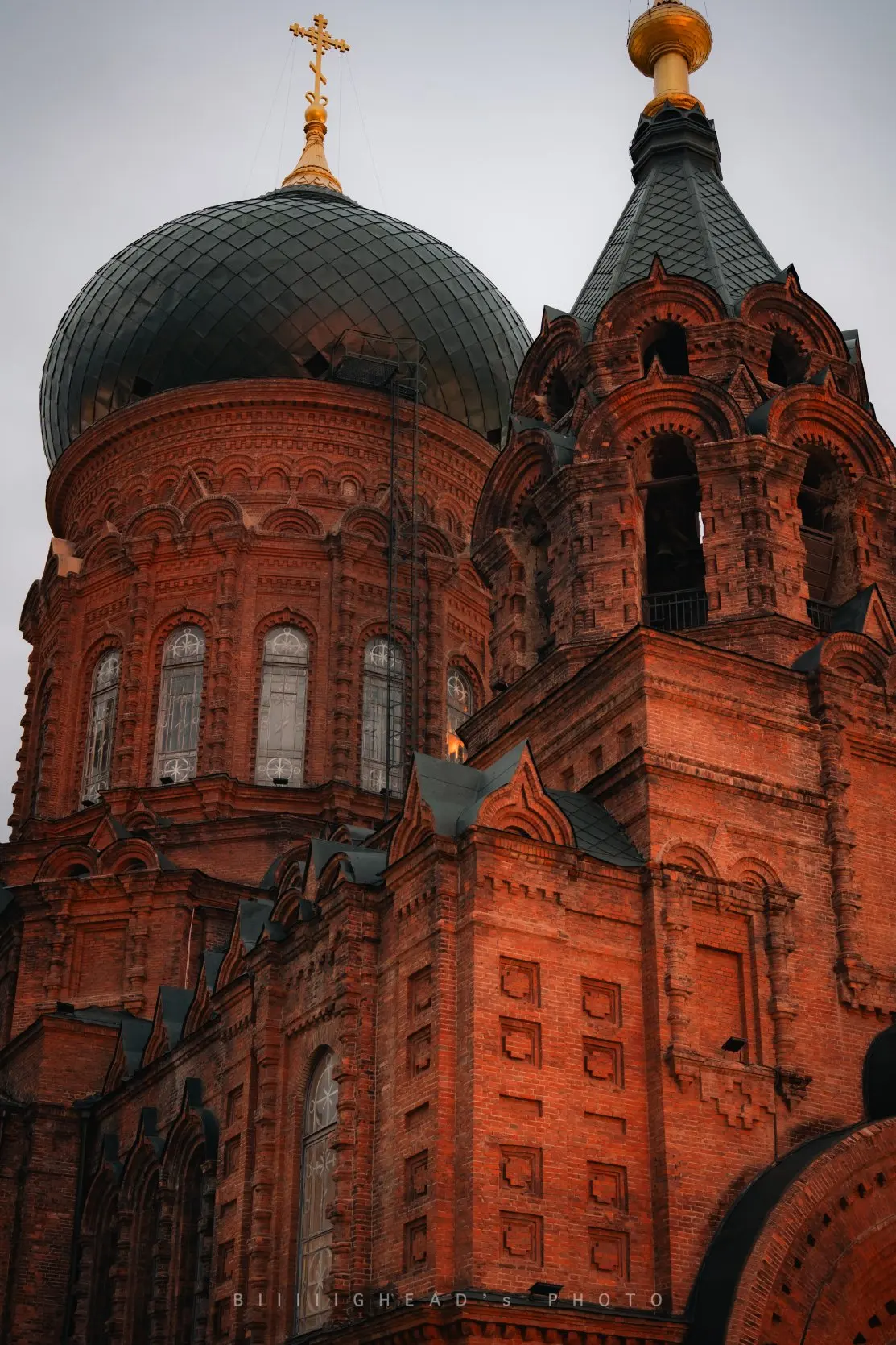 抵达哈尔滨的第一站,我们去了索菲亚教堂。蓝调时分,教堂金色的灯光亮起,和天空的深蓝交织在一起,庄严又浪漫。女儿站在广场上,睁大眼睛看着这座陌生而宏伟的建筑,感叹“像童话里的城堡”。