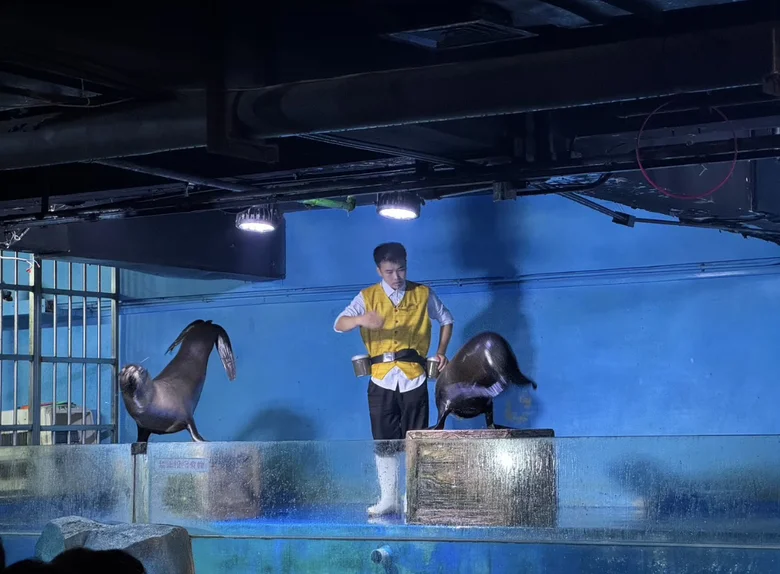 海洋馆就在星光天地负一层,G6直接下地库,车位宽裕,5元/小时封顶35元,对电车还免前两小时。检票进场,5400㎡的展区对低龄娃极度友好,十大主题区动线清晰,左手水母宫右手海豹家,不到百米就能看“萌宠+科普”。10:30的海豹喂食最先开场,饲养员一扬杆,豹先生们拍肚皮、转圈、敬礼,儿子跟着节拍跺脚,现场笑声盖过BGM。
