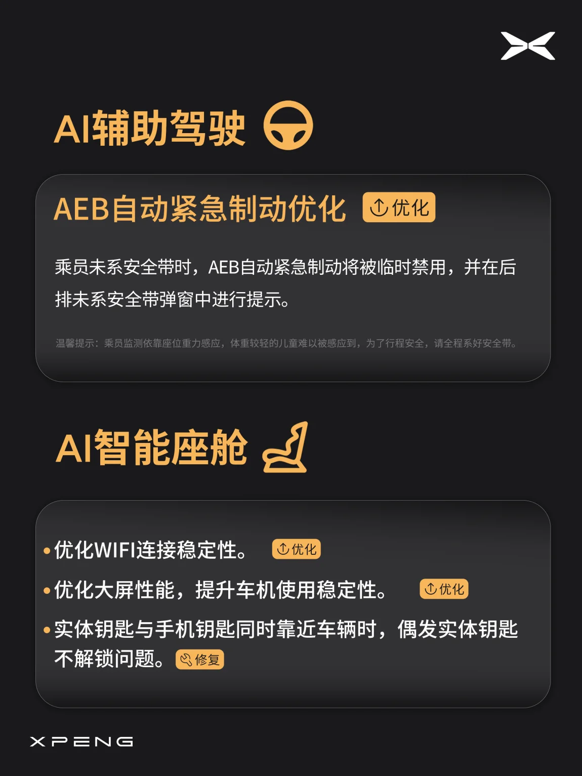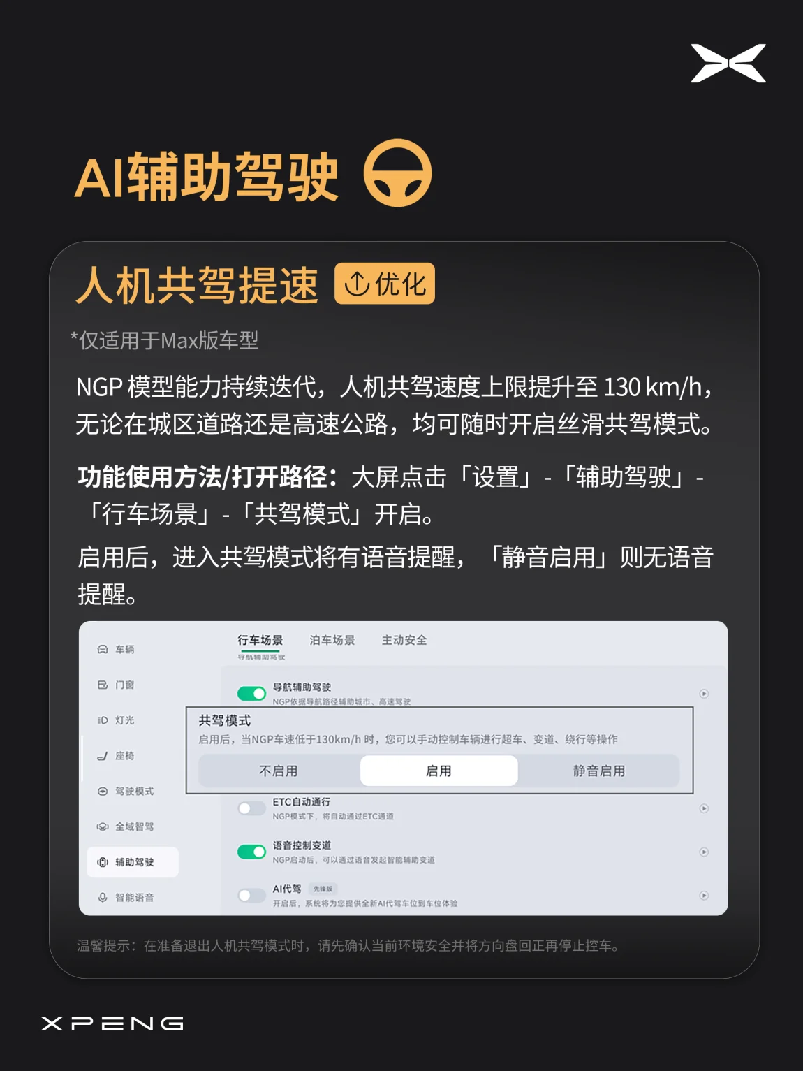 小鹏MONA第十次大规模OTA 已全量推送!💡Max版人机共驾速度上限提升至130km/h💡AEB自动紧急制动、WIFI连接稳定性和大屏性能进一步优化上市以来累计新增优化超400项功能,只为持续给鹏友带来更好的体验~