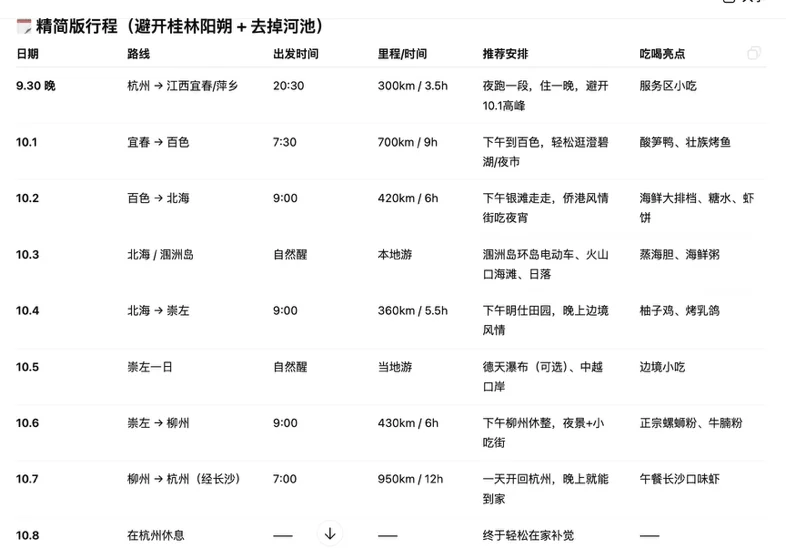 #满电黄金周,山河任我游# 十一假期我准备和朋友自驾去广西,让chatgpt给我出了一个行程,从杭州出发到百色,再到北海涠洲岛,再到崇左,再去柳州吃螺蛳粉。10.7回杭州,10.8休息。看山看海还是小众旅行地。好期待!带了床垫和露营椅,累了困了在车上开露营模式和睡觉模式也很好。开ngp全程也不会很累,电车真好!我爱电车!@鹏友俱乐部 @充电小助手