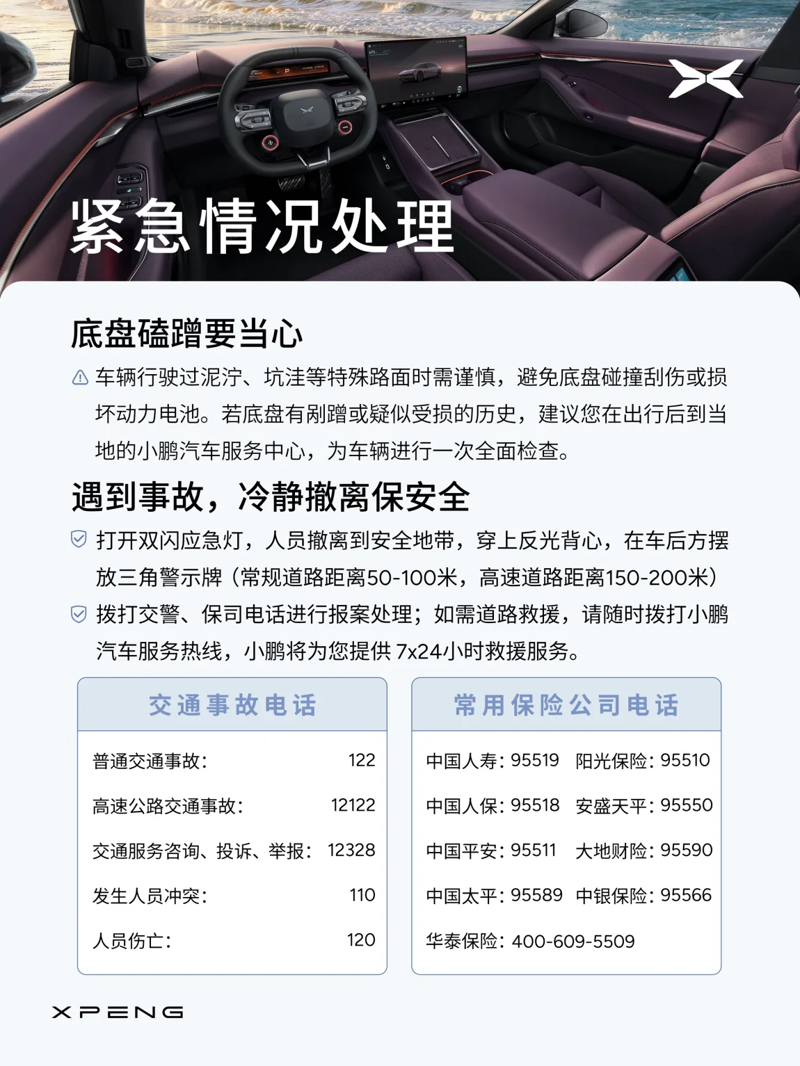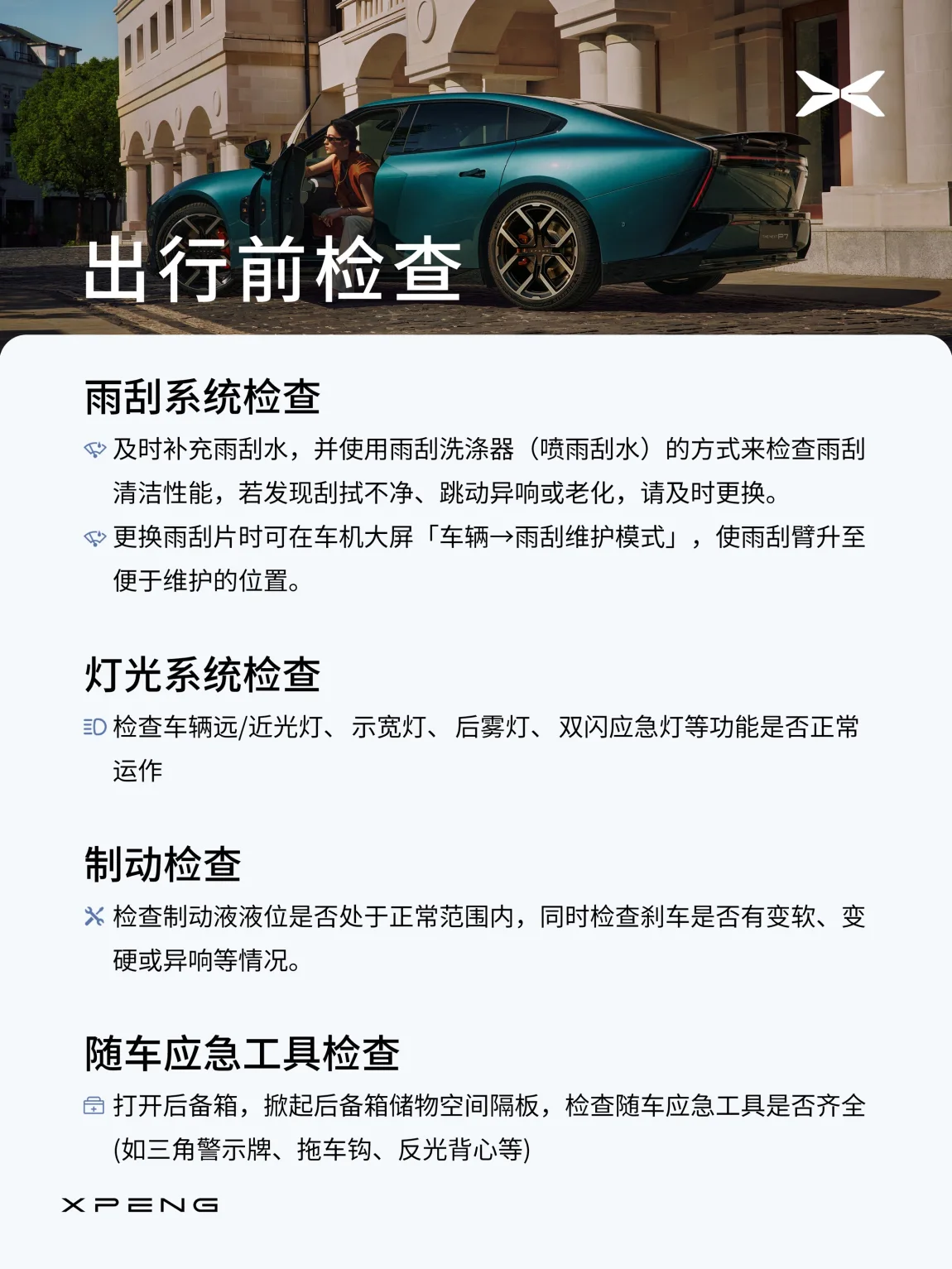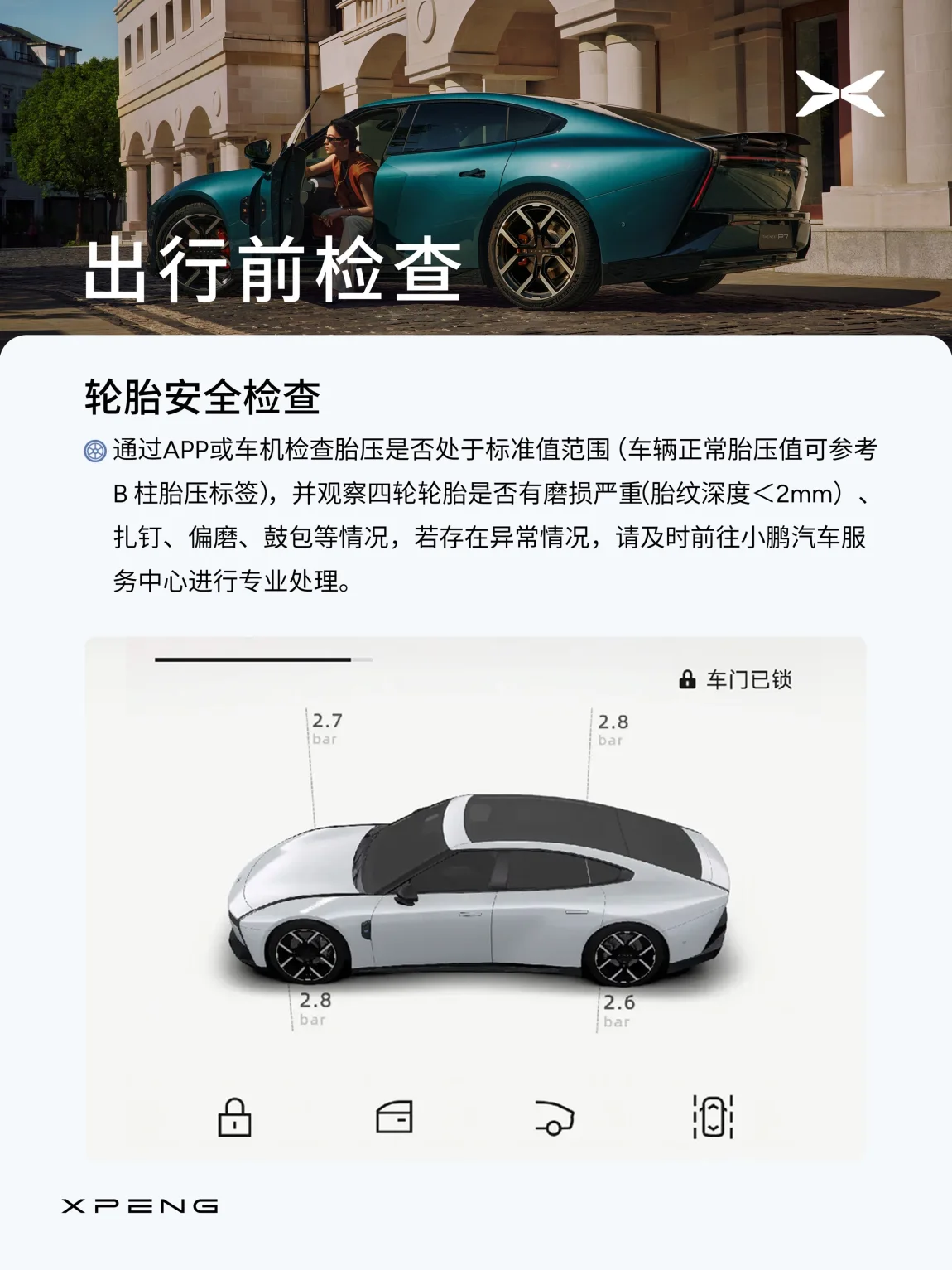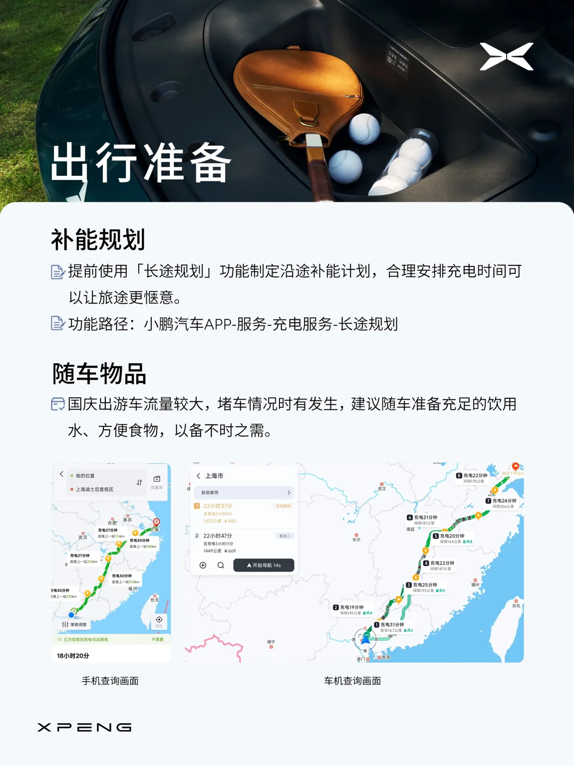 鹏友们,国庆倒计时!出游搭子小P已上线,👇假期出门这份「出行指南」请查收,✅出发前做个全车检查:胎压|雨刮|灯光|刹车|应急工具,出游安心又从容!⚡️ 补能小贴士:小鹏APP提前锁定超充站,续航不焦虑,🚨 安全守护:紧急情况别慌,小鹏服务全心守护,一切准备就绪,出发!这个假期,希望鹏友们玩得开心~