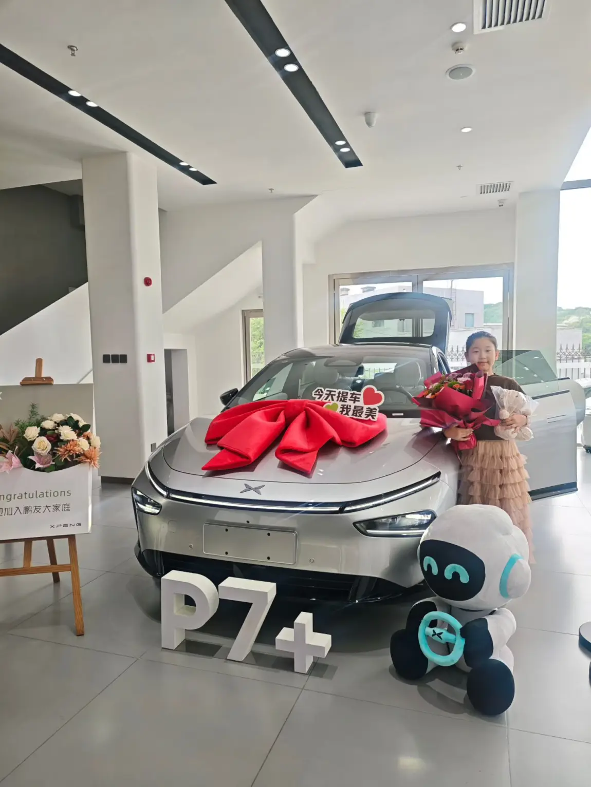 交付专员全程陪同,耐心演示XNGP智驾和语音交互,小P响应超灵敏。手续办理很高效,签合同、办临牌半小时搞定,还收到了小熊玩偶和积分赠品 。专属拍照区的鲜花布景很出片,仪式感拉满。