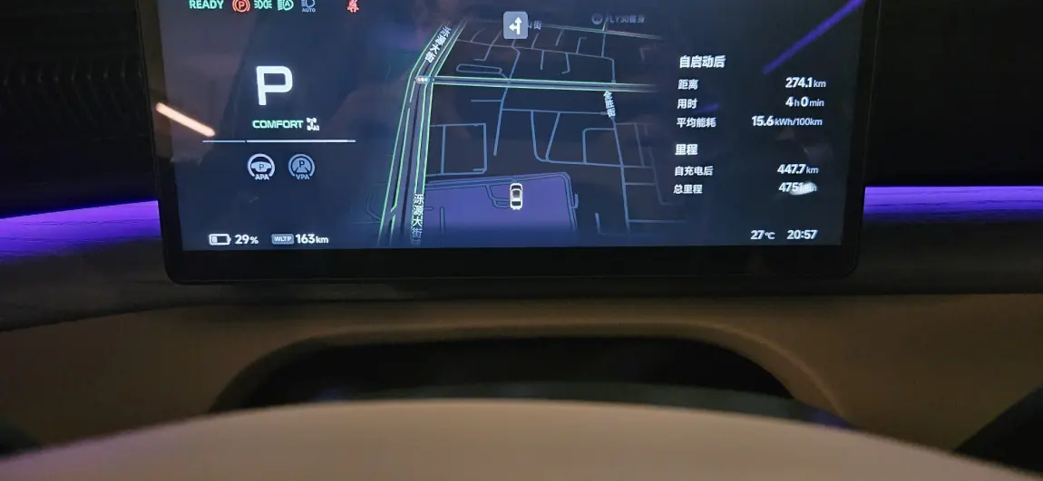 96%的电量出发,wltp545,跑到济南走了447,还剩163,路上正常开,出北京太堵了,上了g3车也不少,这个能耗太优秀了。