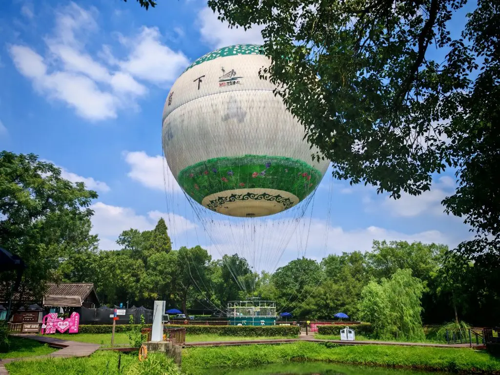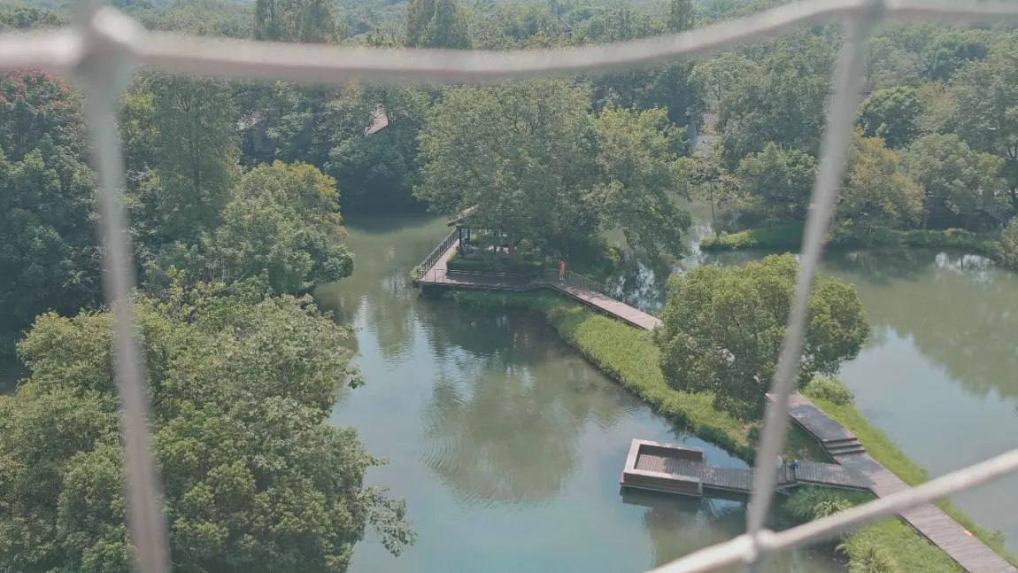 午后转场西溪湿地公园,却遇见另一番天地。乘坐热气球缓缓升空时,脚下的湿地瞬间化作一幅流动的水墨画:芦苇荡如绿色海浪起伏,水道如银链缠绕其间,偶有白鹭掠过,在金色阳光下划出优美弧线。升至百米高空,西溪的“一曲溪流一曲烟”尽收眼底,与西湖的端庄婉约不同,这里的野趣与生机,是自然最本真的呼吸。