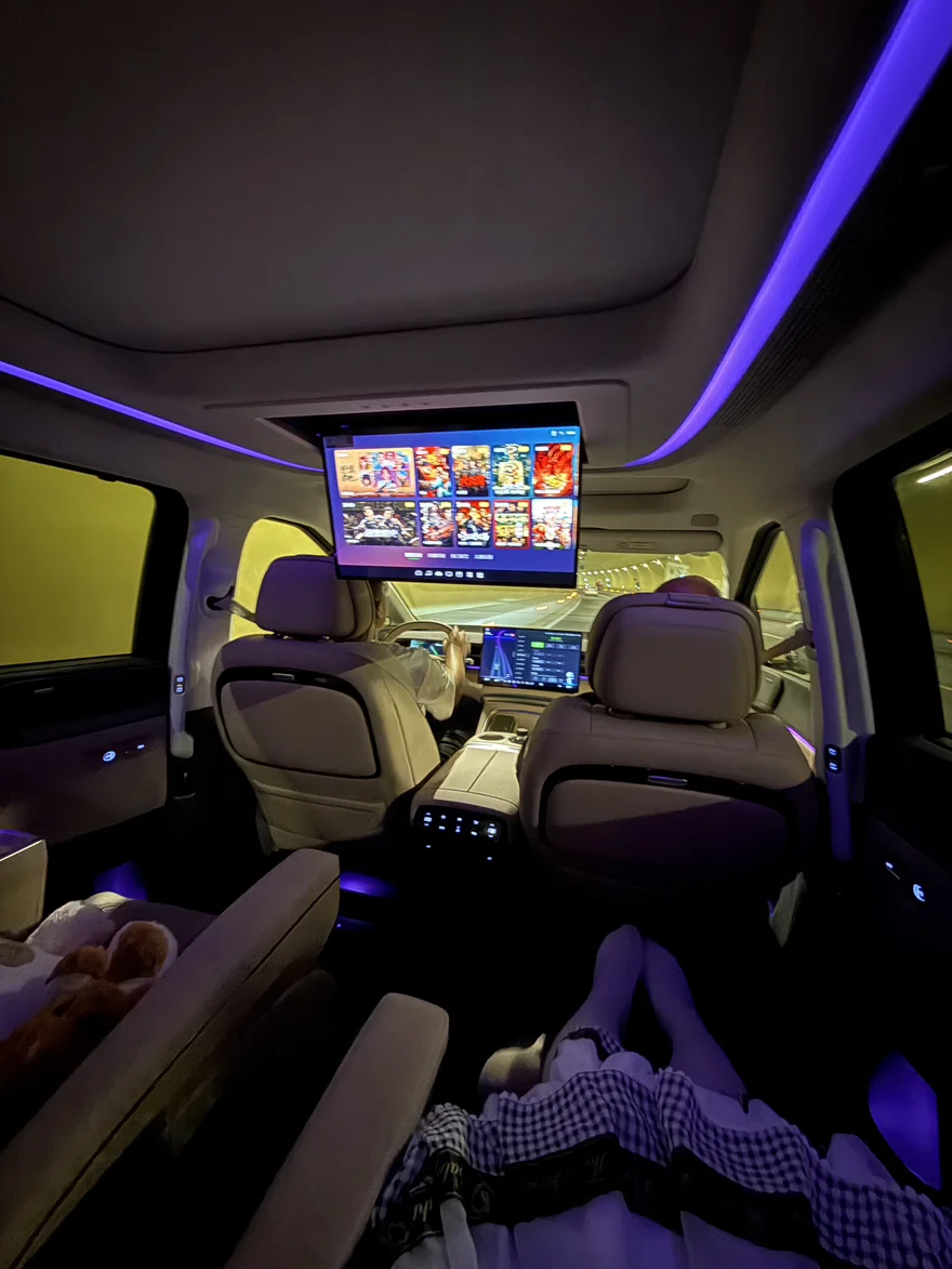 这款车的内饰特别吸引我,真皮座椅软乎乎像云朵,和裙撑的蓬松感莫名适配。中控台简洁大气,大屏操作流畅,语音操控直接懒人的福音,最爱的是环绕式氛围灯,喊“小P切换粉色”,车顶瞬间漫开温柔光晕,连空调出风口都镶着光边,像把茶会现场搬进了车里。