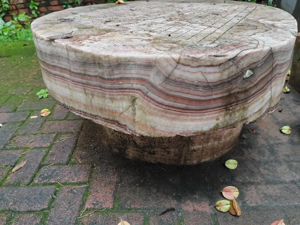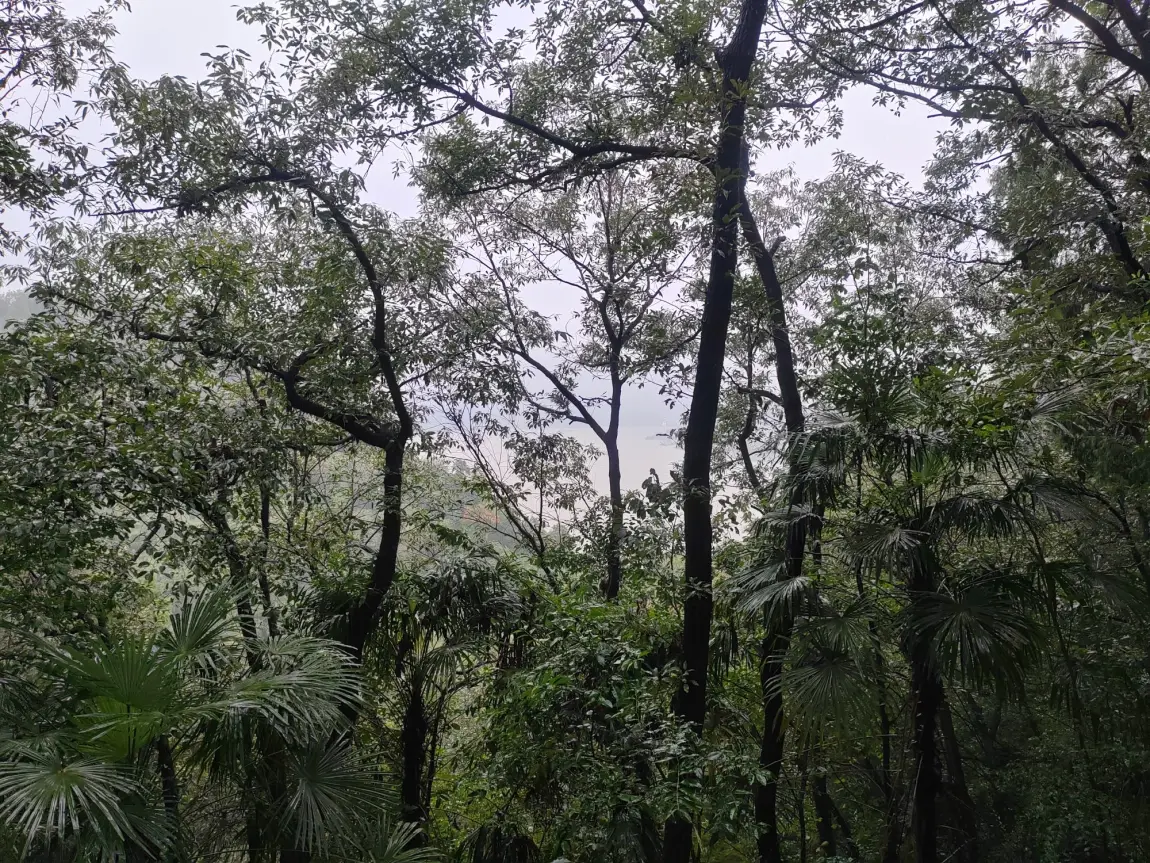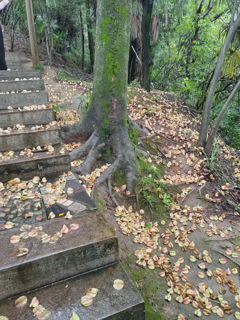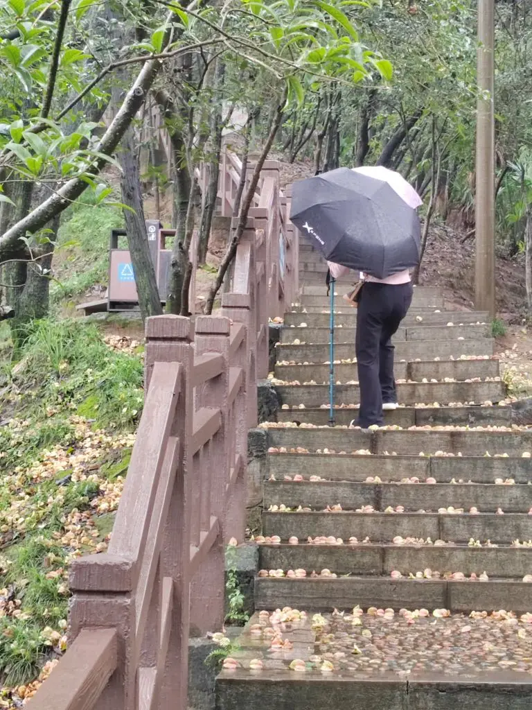 登磨基山,树木阴郁,台阶湿滑,拾级而上。狂风骤雨吹落满地栾树花。
