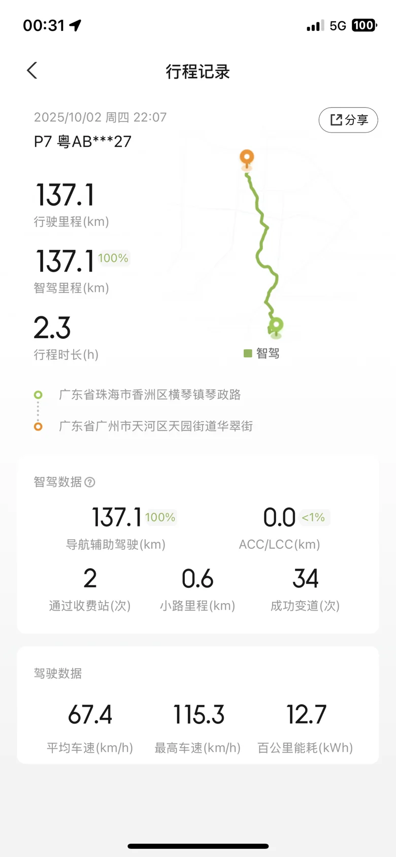 国庆短途自驾旅行,因为刚好换了全新P7,也升级了5.7.8版本,在设置导航后,让小P自己安全的驾驶到目的地,晚上回家太累了,不小心全程用了辅助驾驶,能耗算非常低,使用过程也很安全#全民限时挑战智驾百万公里# #智驾Tips#