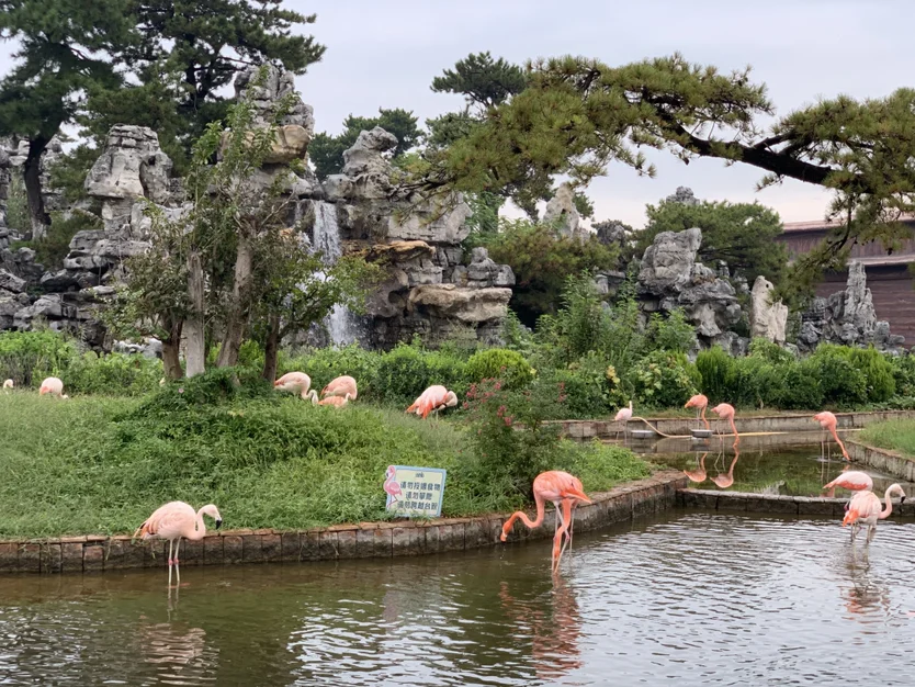 开门迎接游客的是火烈鸟,池塘配上青松和假山,自成一副美景。