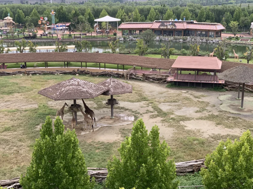 非洲草原部分,除了穿搭经典的斑马,还有长颈鹿。投喂长颈鹿最需要力量。长颈鹿咬住树枝不放,整颗拽走。如果游客力量大不松手,长颈鹿便会像撸串一样将树枝上的叶子都卷进嘴里。