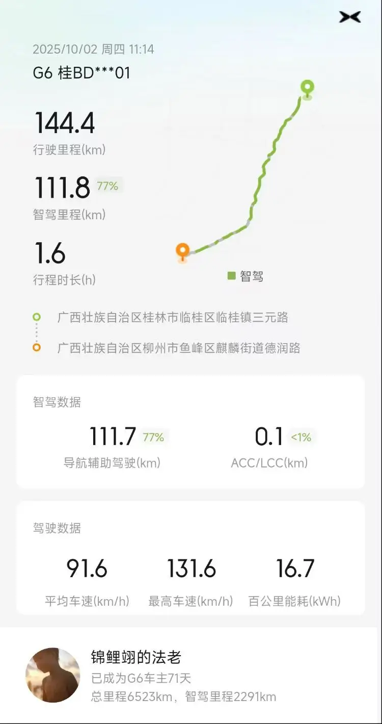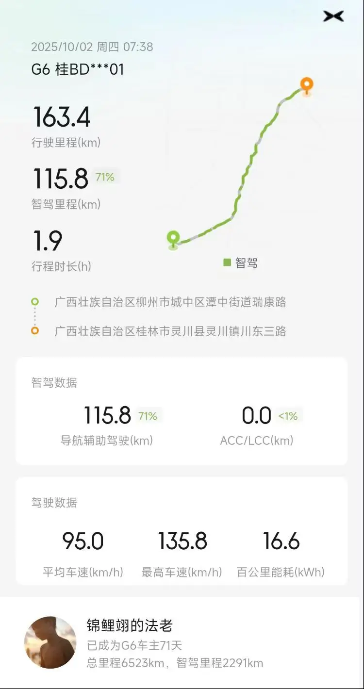#小鹏汽车 #小鹏辅助驾驶10月2日,来了一个特种兵桂林米粉游,就为了吃一碗桂林米粉。为了避开桂林市区,直接开车到八里街菜市的米粉店,吃完回家。全程来回344公里,耗时5小时,吃粉半小时,桂林4S店充电二十分钟,智驾240公里左右。NGP智驾让我活力满满,服务区都没有去过。最后一张在平路,一人时速20左右的电耗,哈哈!