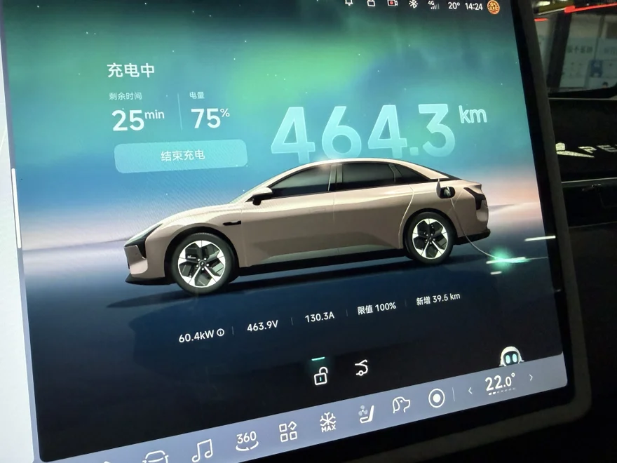 从市区出发时特意查了路线,沿途高速服务区的小鹏超充站密度高到离谱——平均每50公里就有一座,蓝白相间的站体在服务区里特别醒目。最绝的是充电速度,吃个午饭的功夫(约40分钟),MONA的电量从30%飙到80%,回血300多公里,完全不耽误进山的行程。