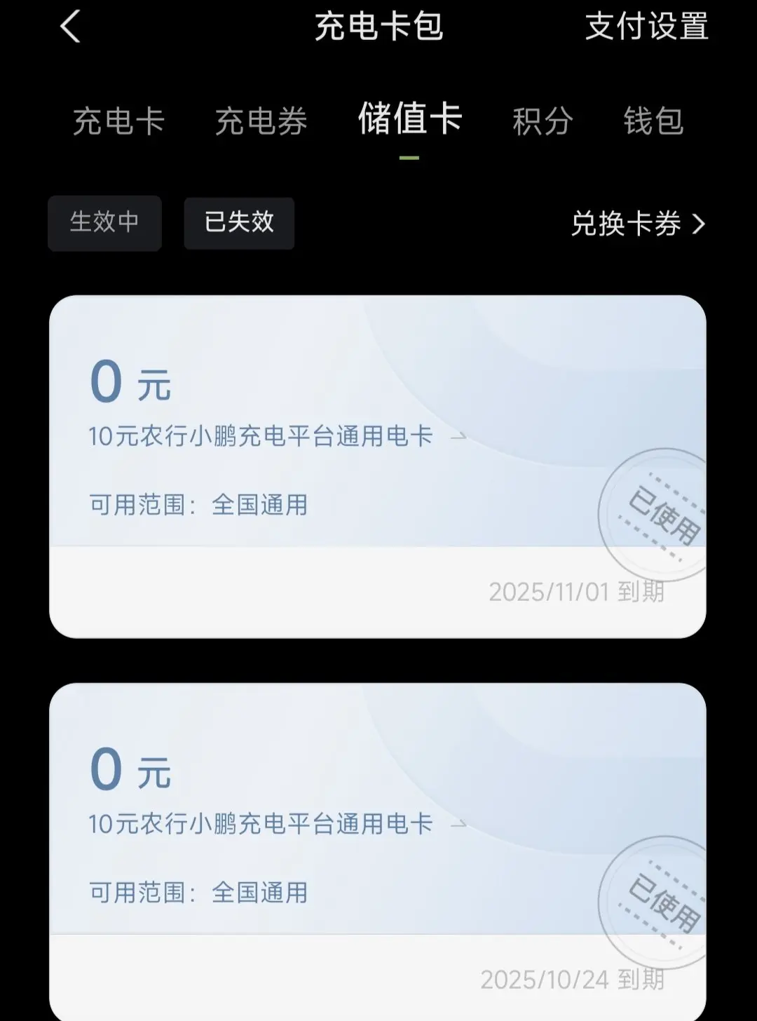 叠加农行和小鹏一起做的活动,0.1元购10元储值卡,充电实在是太过于划算。