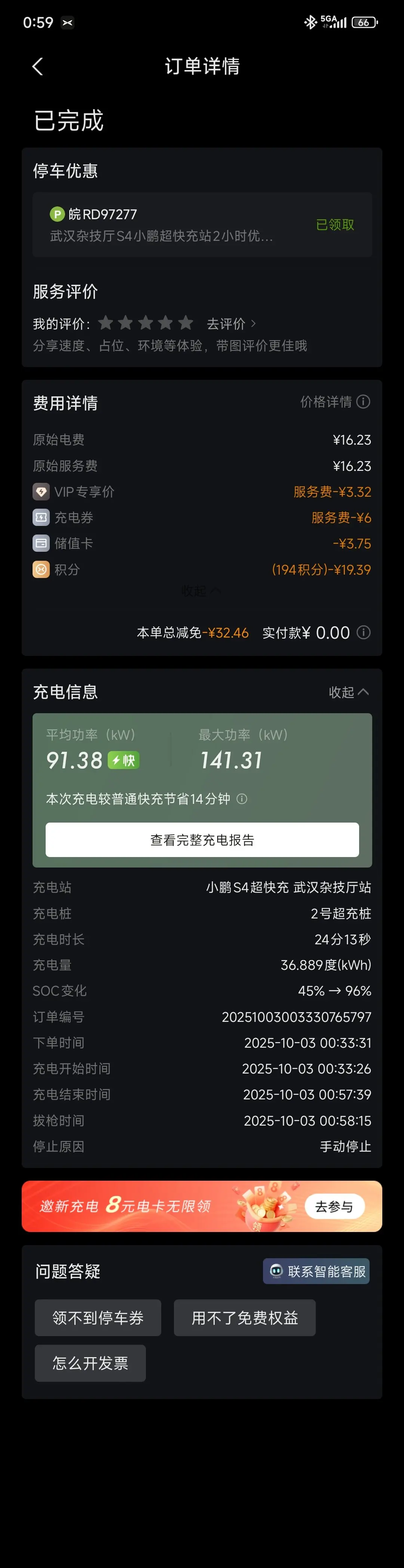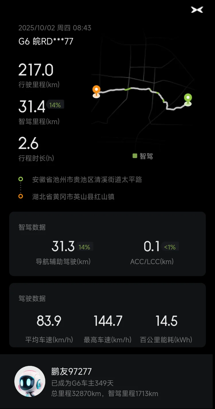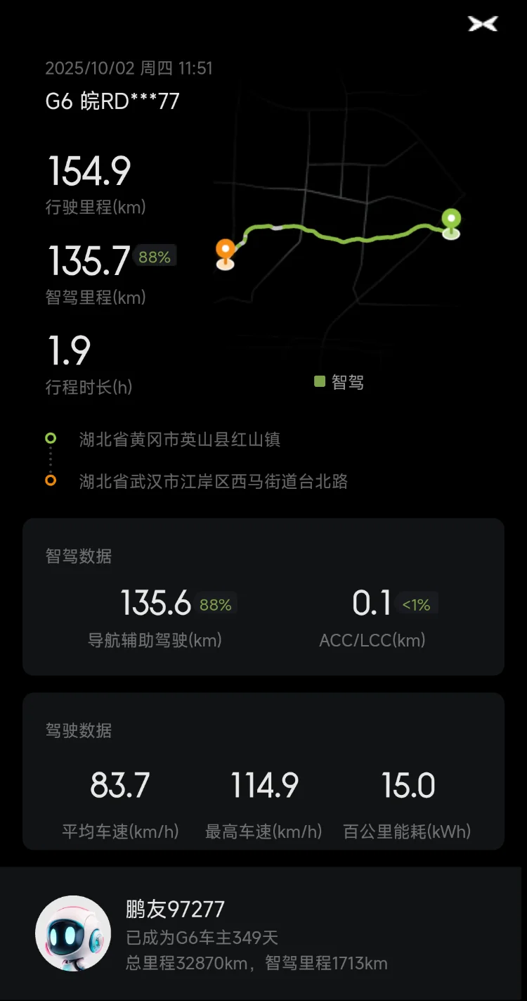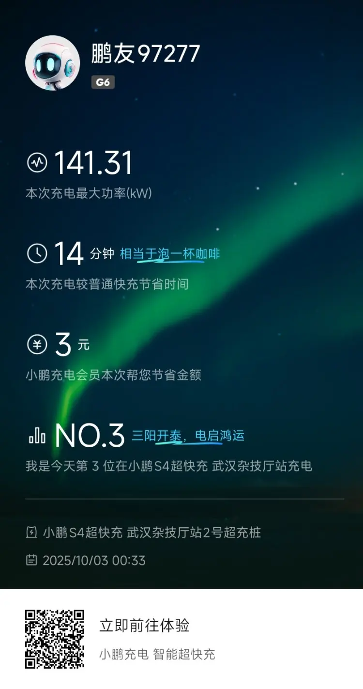 小鹏汽车为鹏友们的旅途充满每一度电!国庆期间小鹏汽车推出高速充电免66度服务费电卡!应该说是全国都好用,我在安徽、武汉高速上充电都得到了实实在在的优惠。这个国庆无论是穿越西北荒漠还是沿海环行,扫码即充、即充即走,进一步降低出行成本,彻底告别里程焦虑,让诗和远方从满电开始⚡