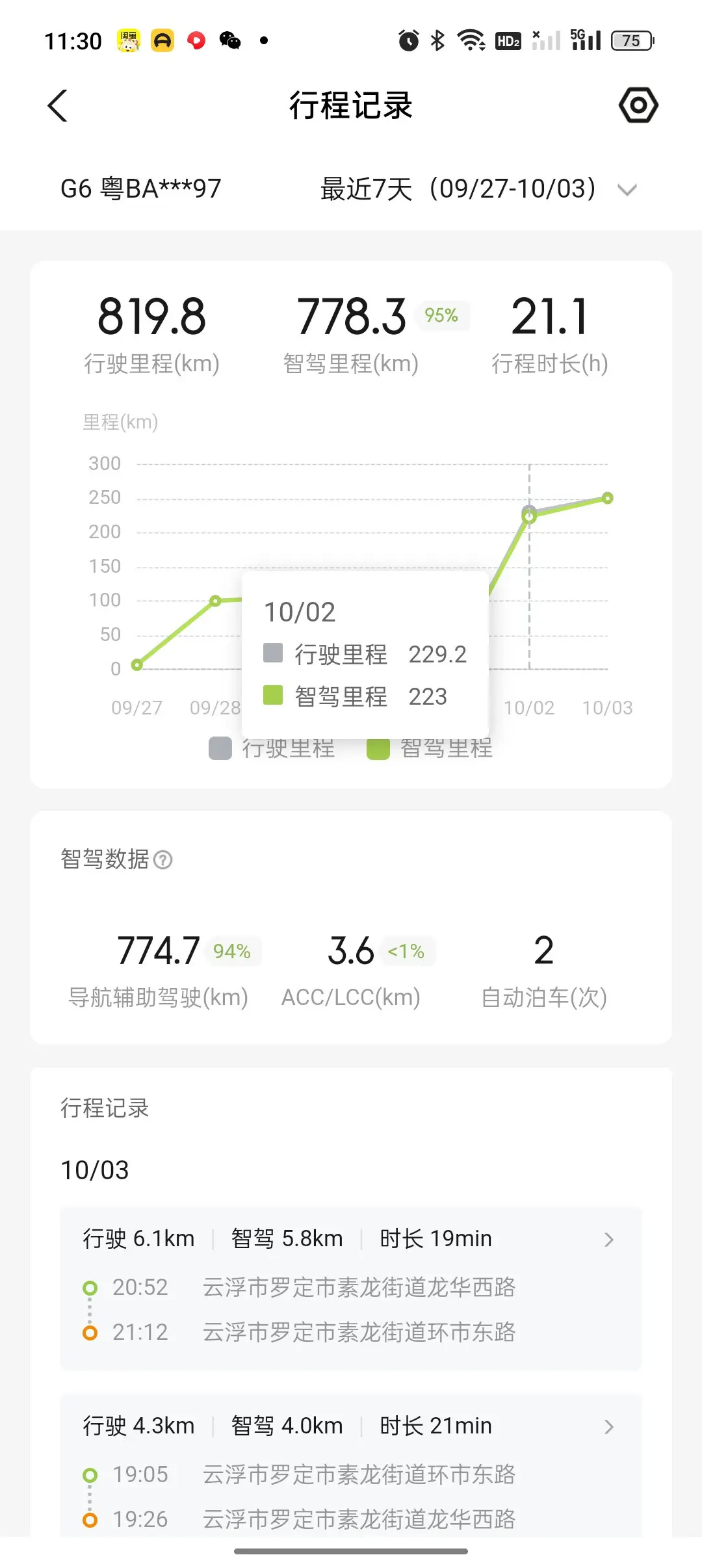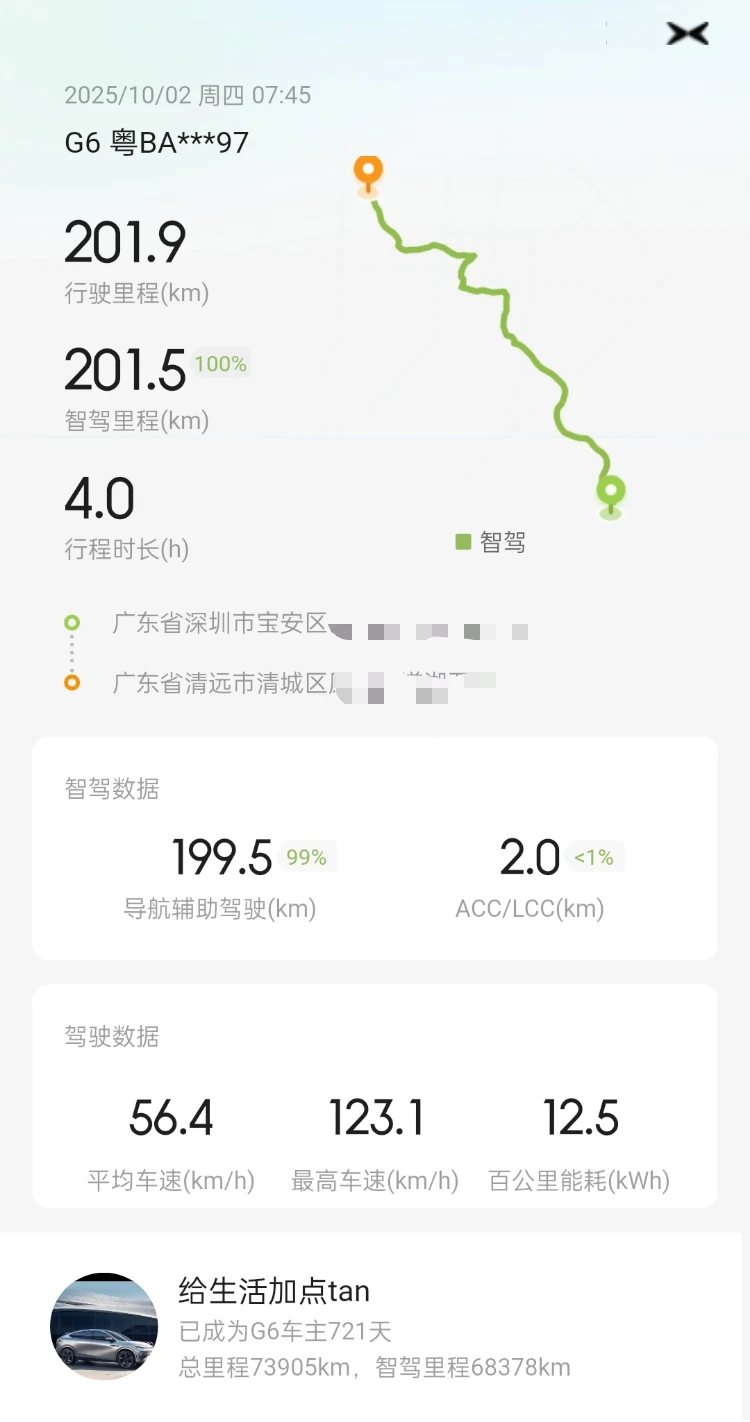 没想到2号还那么堵,开了200公里开了四个小时,下面是吃午饭时,201.9公里,智驾201.5公里,智驾比例100%。
