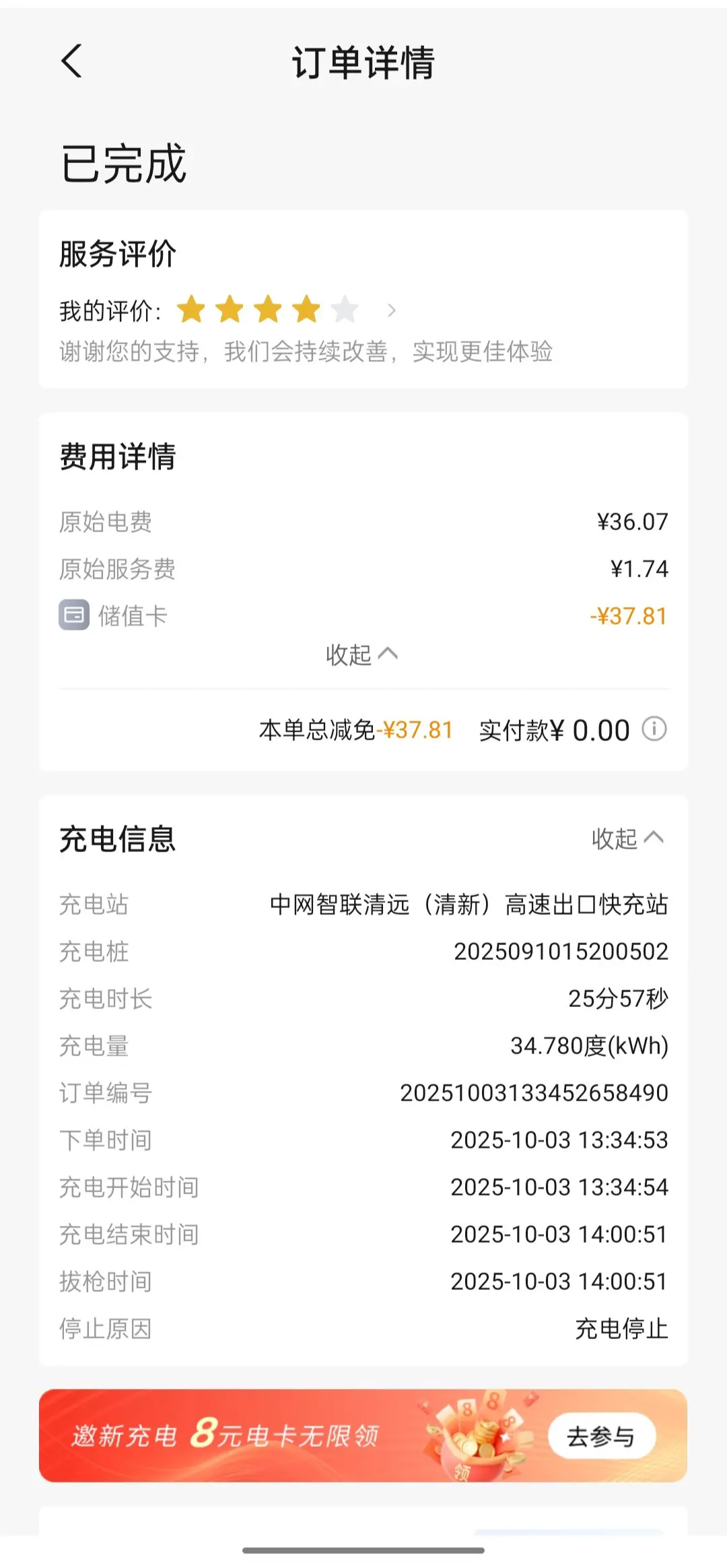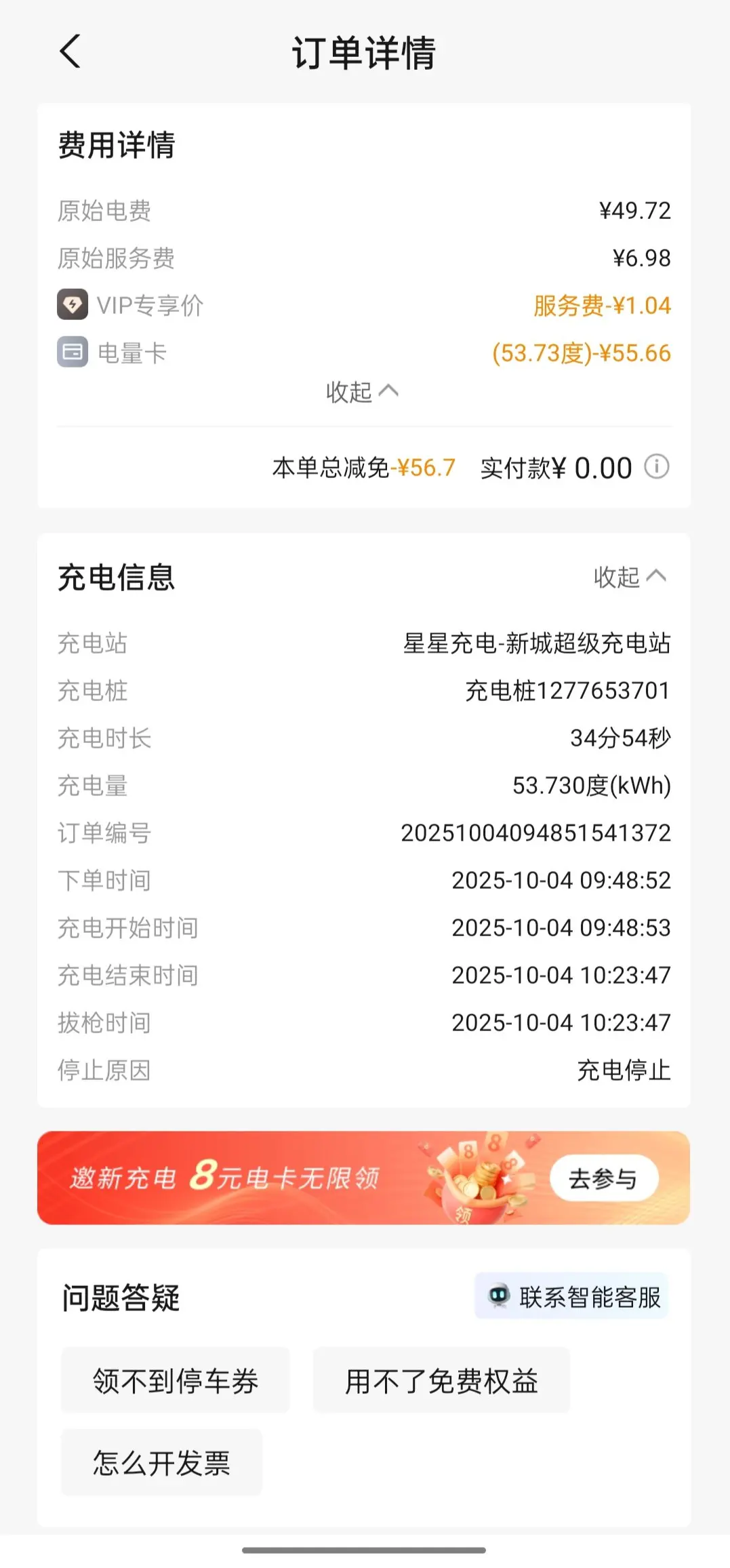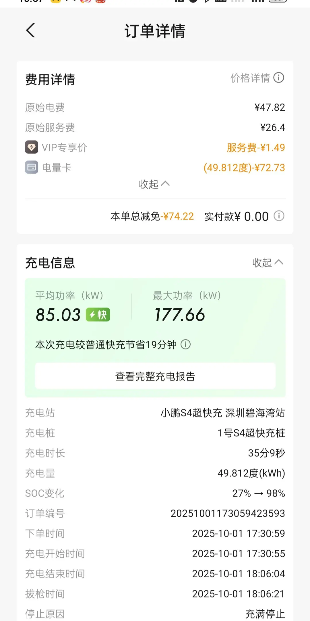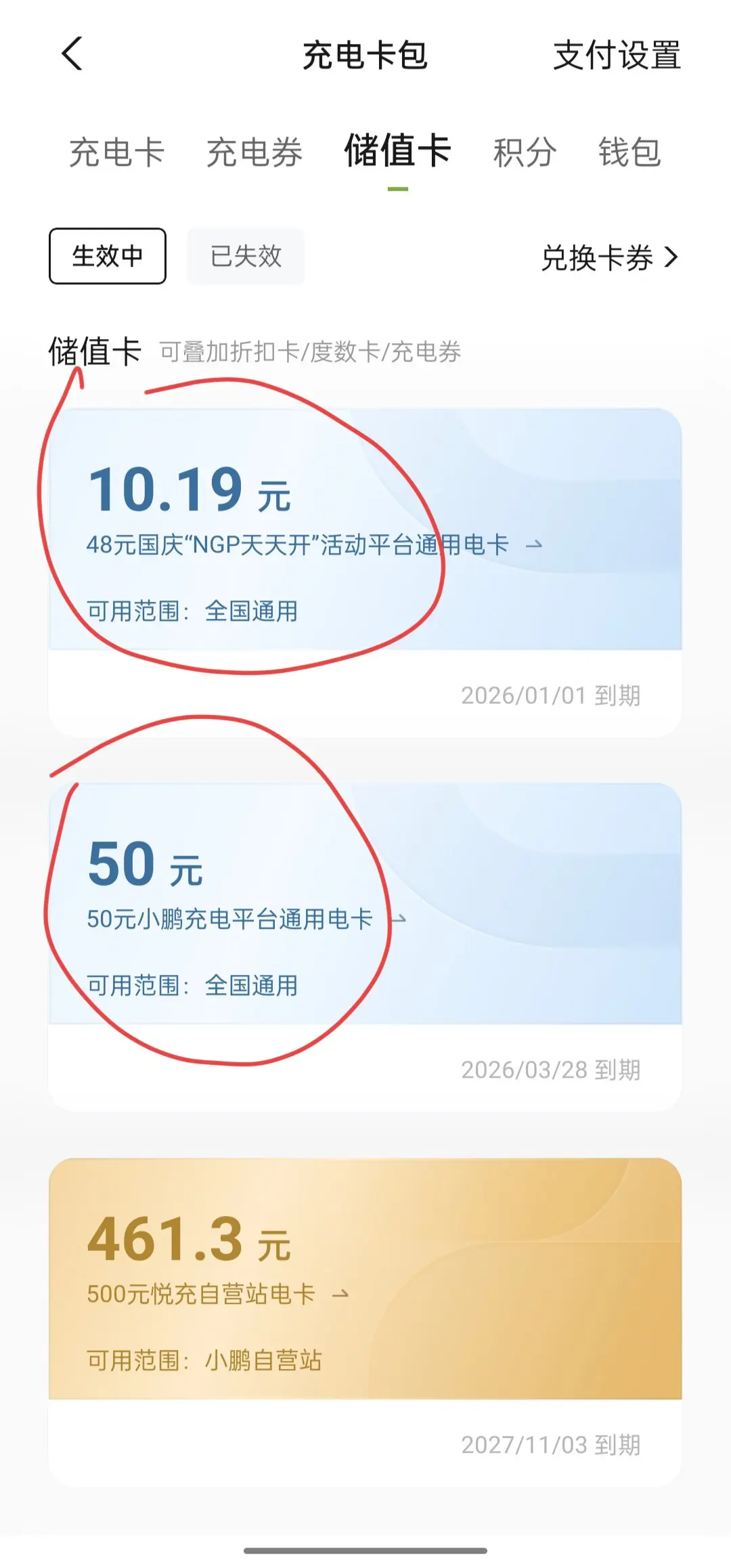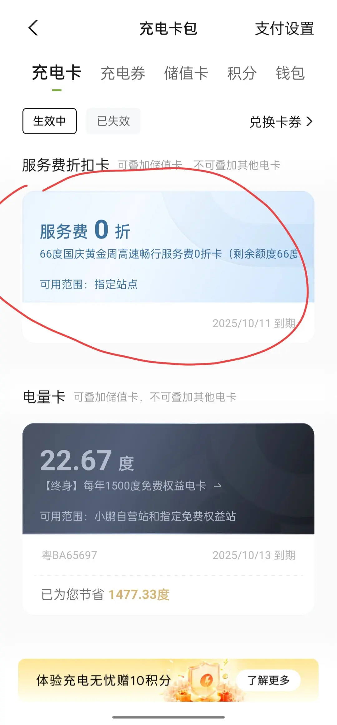 首先在小鹏app领取国庆大礼包48元➕50元通用储值卡,再领取66度电高速免服务费电卡,结合1500度免费电卡,实现了充电免费。