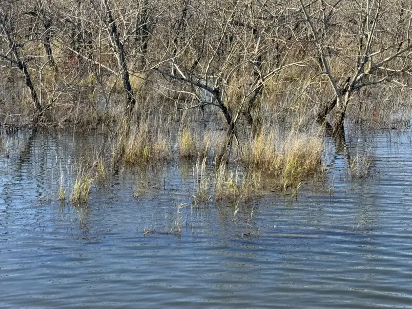 湖水清澈,倒映火山岩遗迹;火山岩间树木多已落叶,只剩枝干与几片残叶,显得孤独却极具力量。
