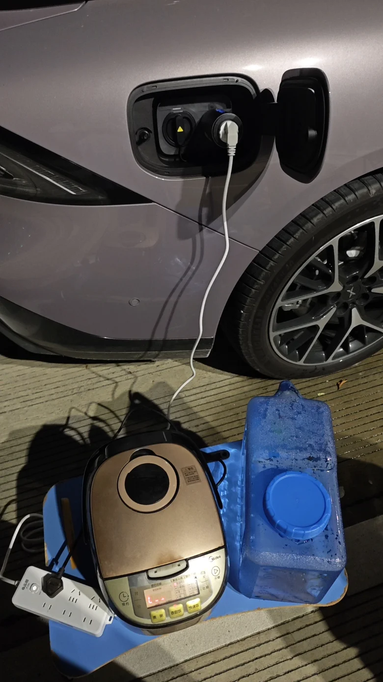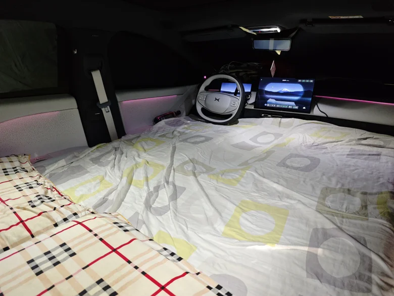 按照规划,我们在中途的一个服务区进行了第一次充电。我们打算服务区休息,使用外放电煮了晚餐,睡觉的时候使用大床模式铺上气垫就可以睡觉了,这样的旅行方式第一次尝试,还真不错。