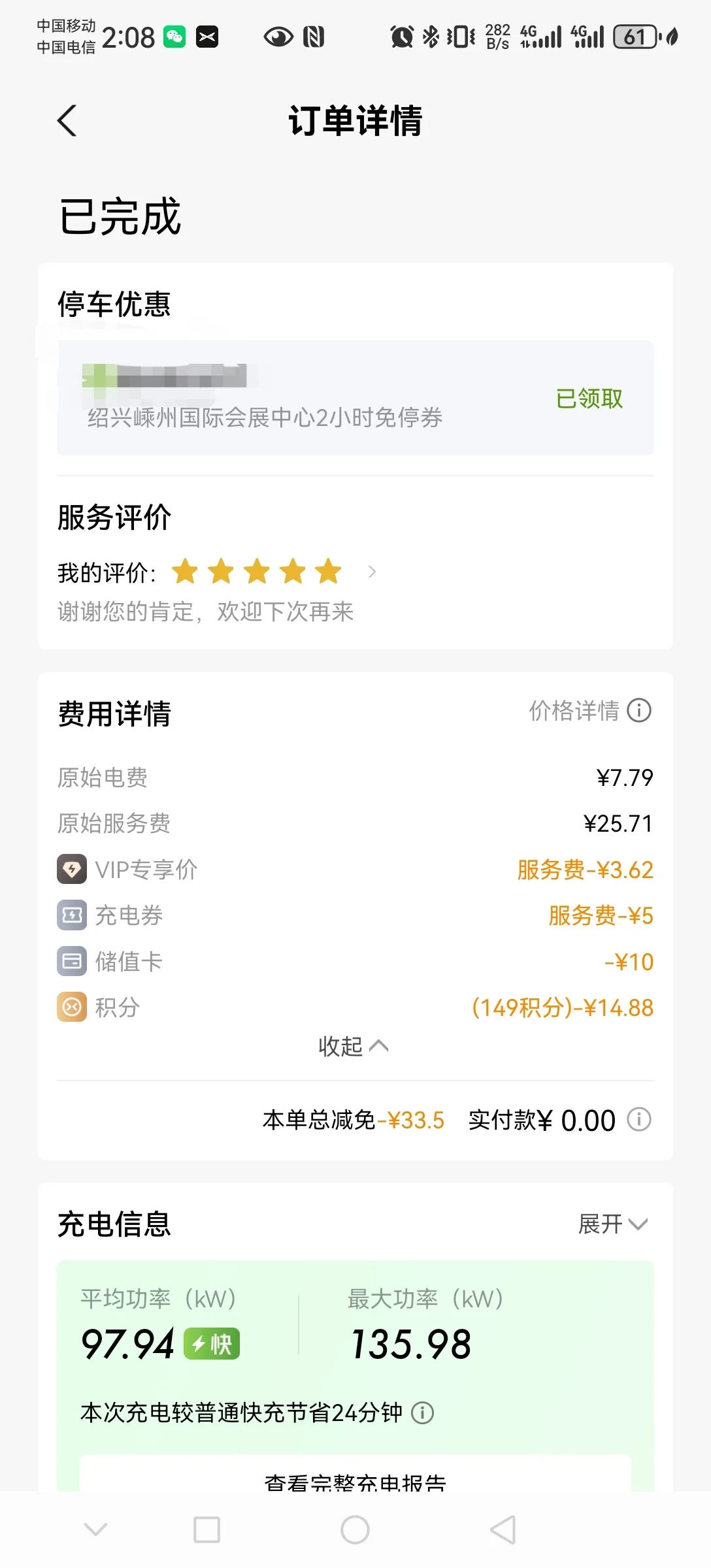最绝的是叠加充电券、积分抵扣,最后实付0元!(订单详情笑疯)本来想点个肯德基歇一会,结果肯德基还没出餐电已满格,全程没排队没焦虑~给我留了半小时免费停车时间,注意充满超过半小时就要收1元每分钟占用费,以前担心充电时间太久,现在是担心充电太快产生占用费