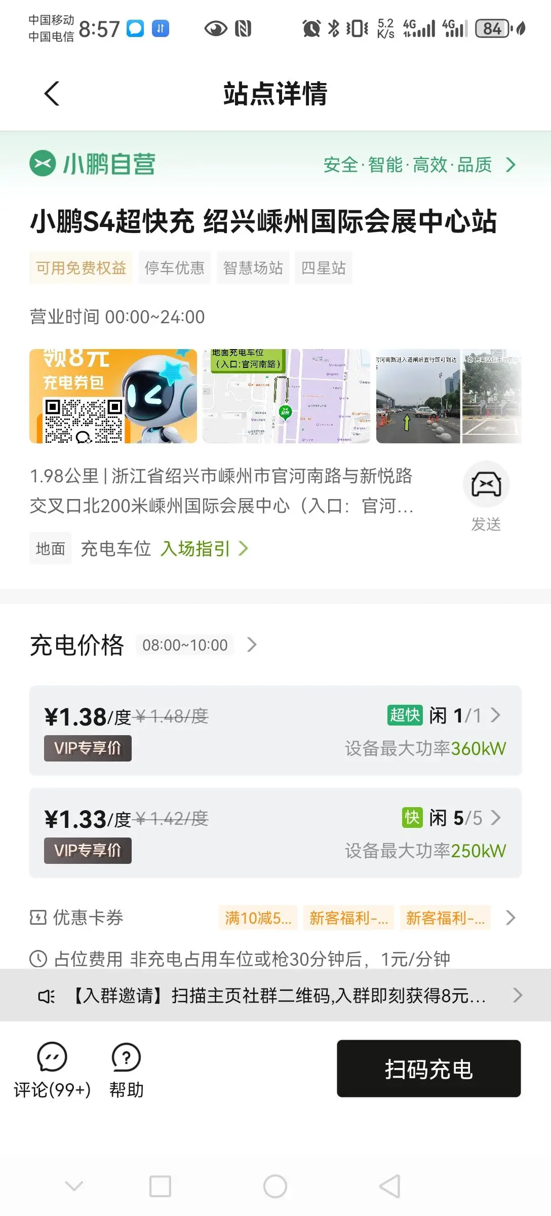 出发前我用小鹏导航规划路线,系统直接筛选带超充站的地点。开到嵊州时电量剩20%,顺路拐进「小鹏S4超快充 绍兴嵊州国际会展中心站」。这站太懂用户了:24小时营业,入口就在官河南路,导航精准不绕路;超充桩最大360kW,当时超充桩满了,不过旁边还有一个空闲快充桩,反正不赶时间,插枪秒启动!
