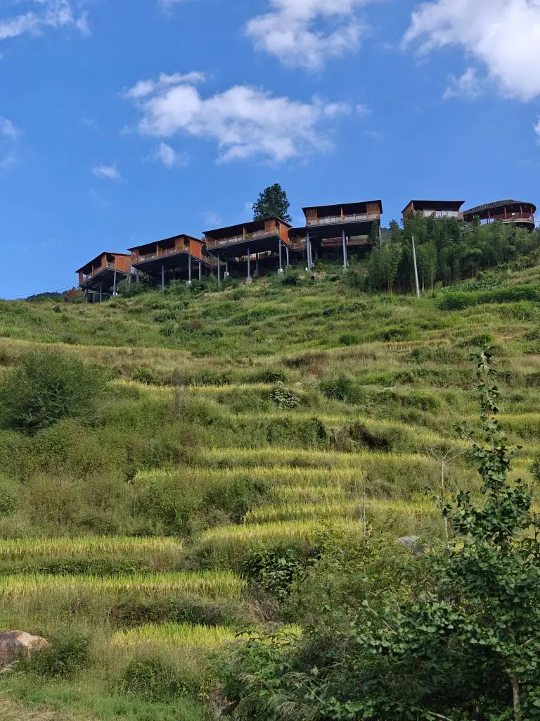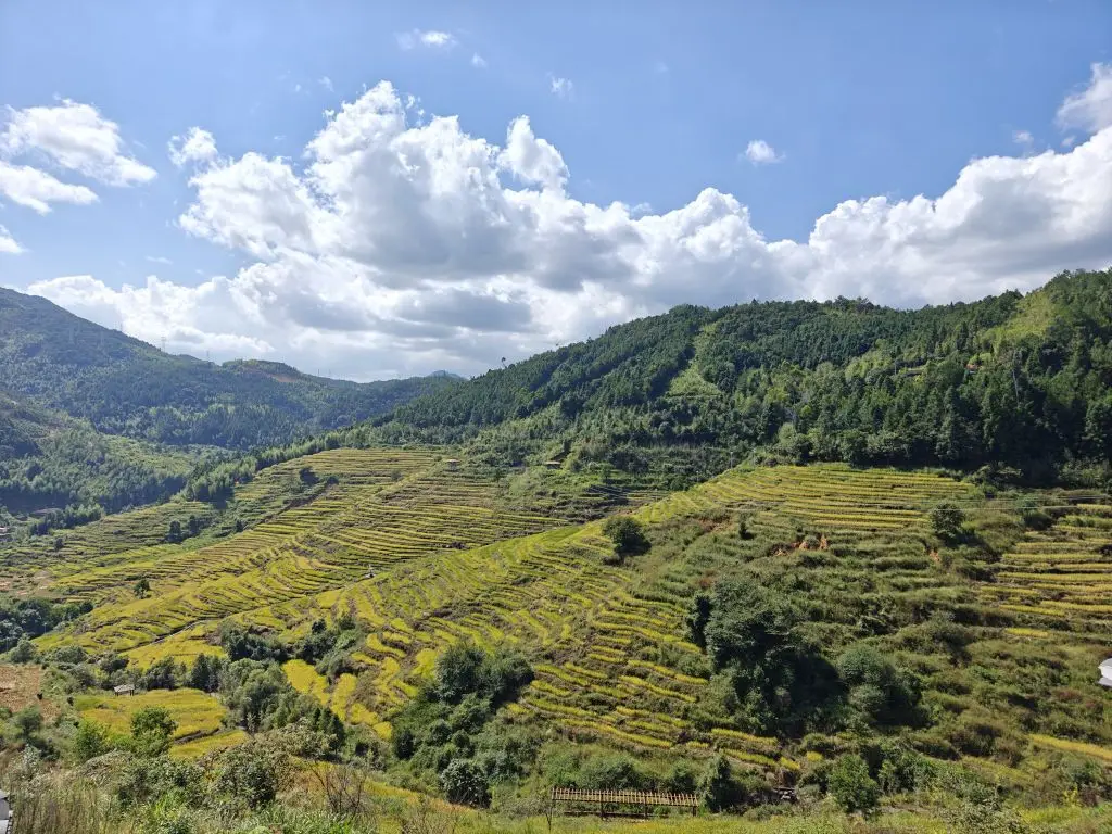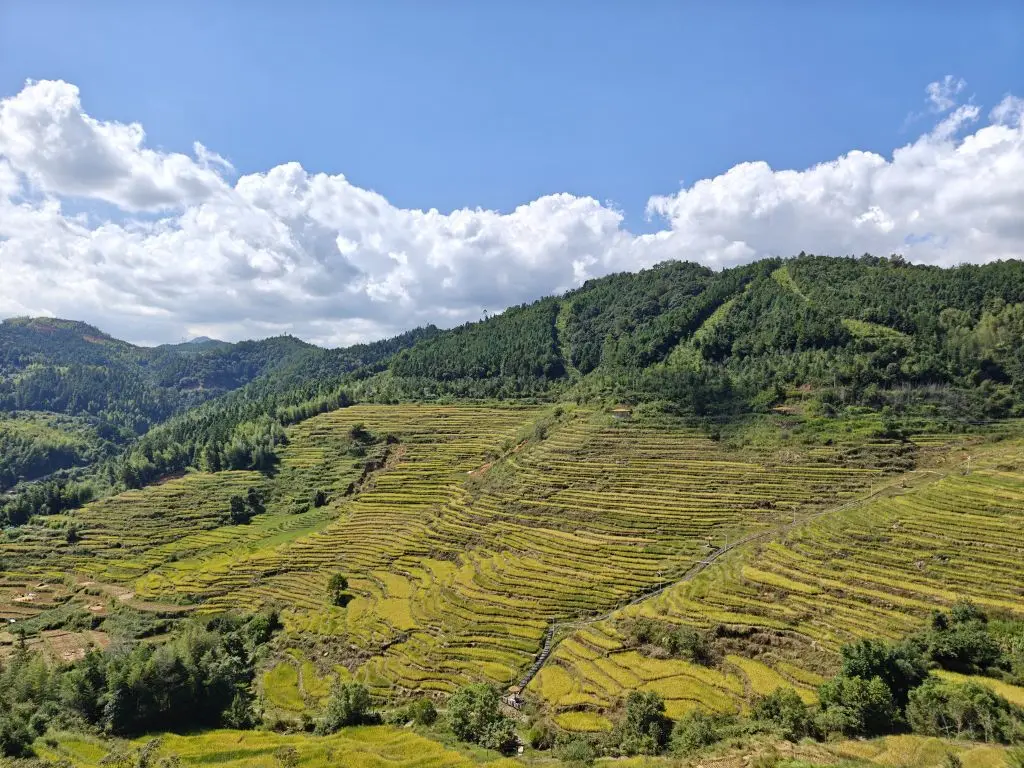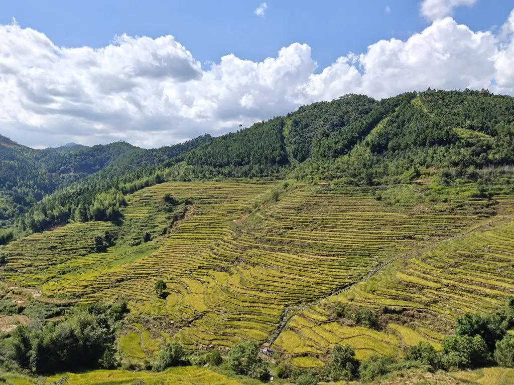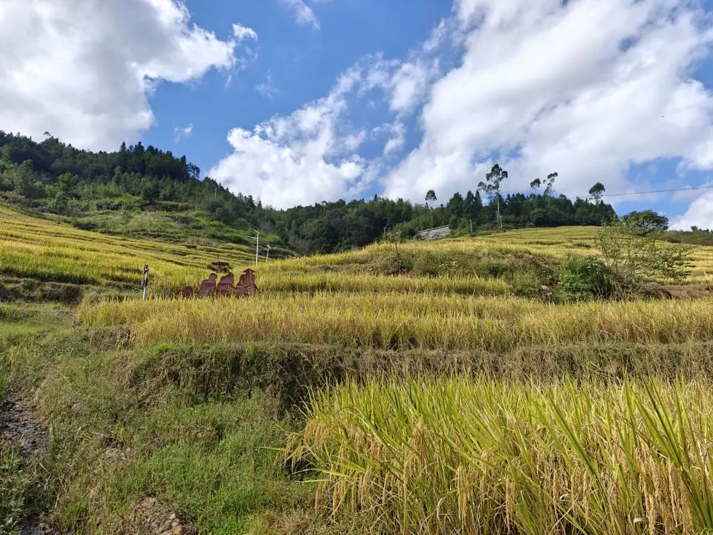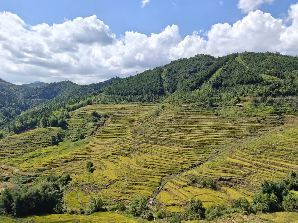吃完饭就要开始我们今天的晒秋之旅啦!沿着观景步道,伴着蓝天白云,略带金黄的稻田组成的梯田像画一般映入了我们眼里,耳边只有蝉鸣和风声,这种意境真是让人心旷神怡!