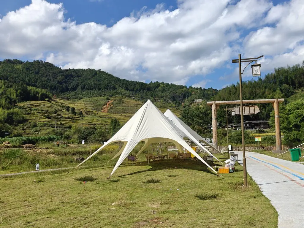最后,我们来到露营基地,仰视着上面的梯田观景平台,周边弥漫着稻谷的香味,复得返自然在这一刻便具象化了!