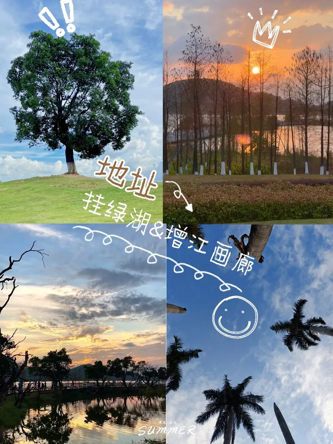 🎣 钓鱼党别错过!挂绿湖和增江河都有好多热门钓点(不过空军了也别骂我hhh),挂绿湖的鱼🐟可不少,不想思考的时候就带上你的鱼竿坐那儿,盯着浮漂晃啊晃,等着鱼儿上钩,就算没钓着,吹着湖风发呆也很舒服,看看落日和波光粼粼☀️,特解压!