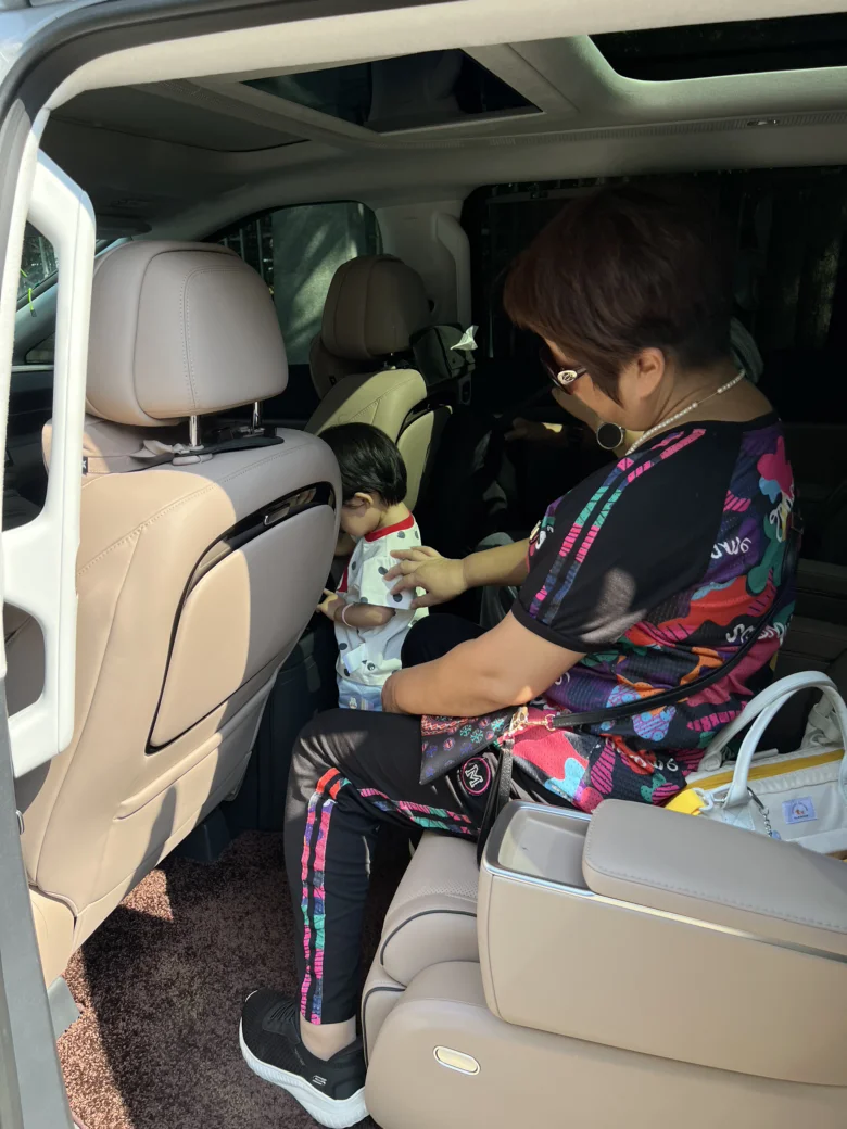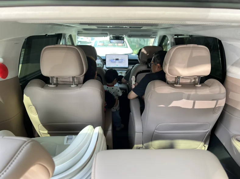 ▶️平时出门,不带上爷爷奶奶或者外公外婆,如果我们两个出门简直累瘫,所以现在基本上9是坐5人出行。娃的安全座椅放三排,奶奶在三排陪她,睡着后就回二排,爷爷则是在二排零重力休息。我开车,队友坐副驾。这样的每个人空间还是很大的。