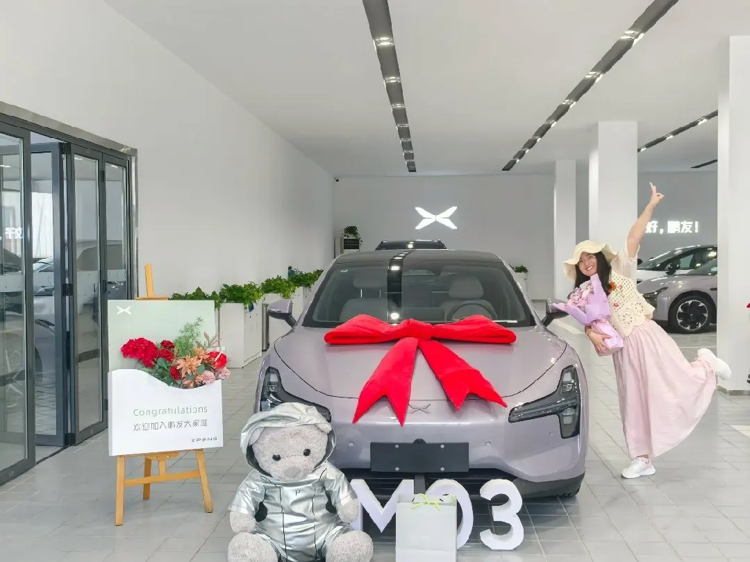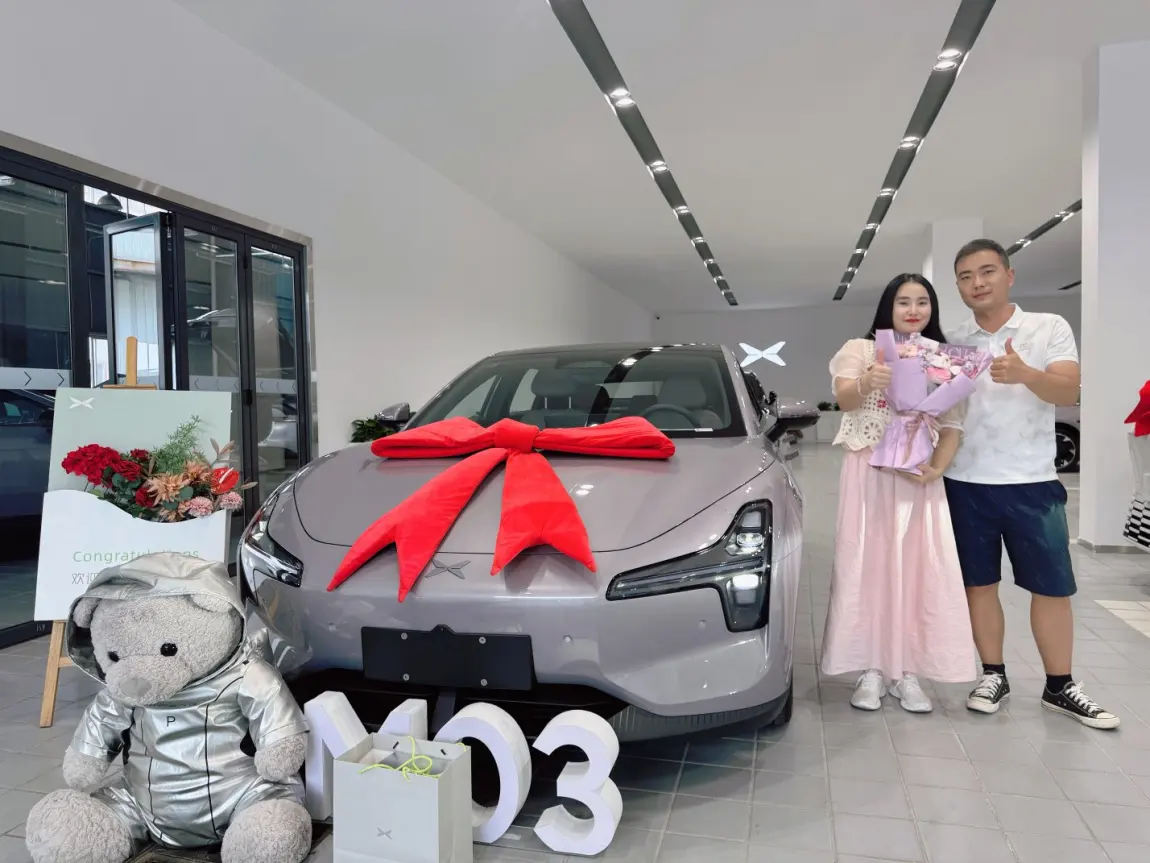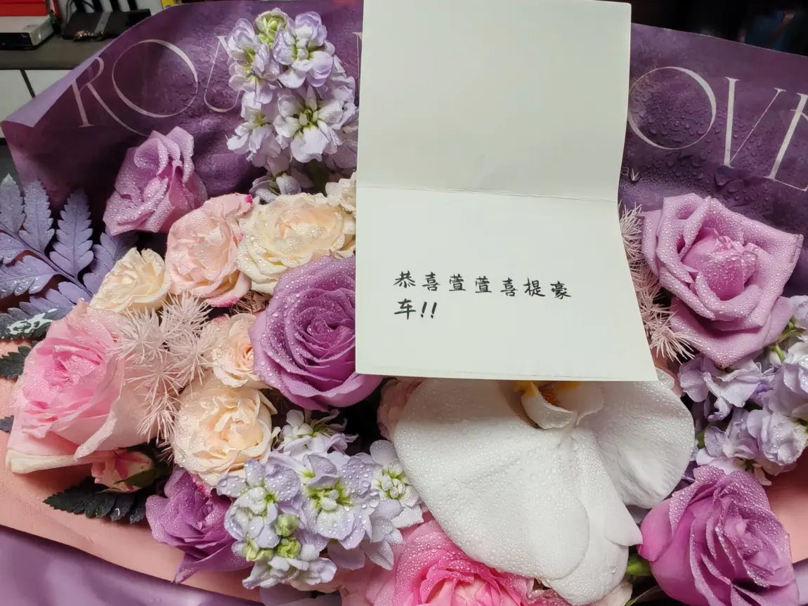 🌟等了不到三周,我们就提车啦!提车前相当激动,晚上都睡不着哈哈哈哈,到了店里快中午了,小哥还给我们点了餐,我看到了很多紫色小鹏哈哈哈哈,颜值好高,好漂亮!我对象还送了一束花,紫色的,好配!爱不释手,多拍了几张照片嘿嘿😊
