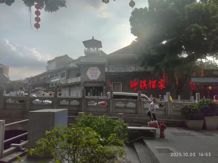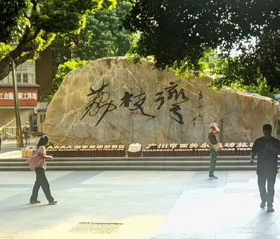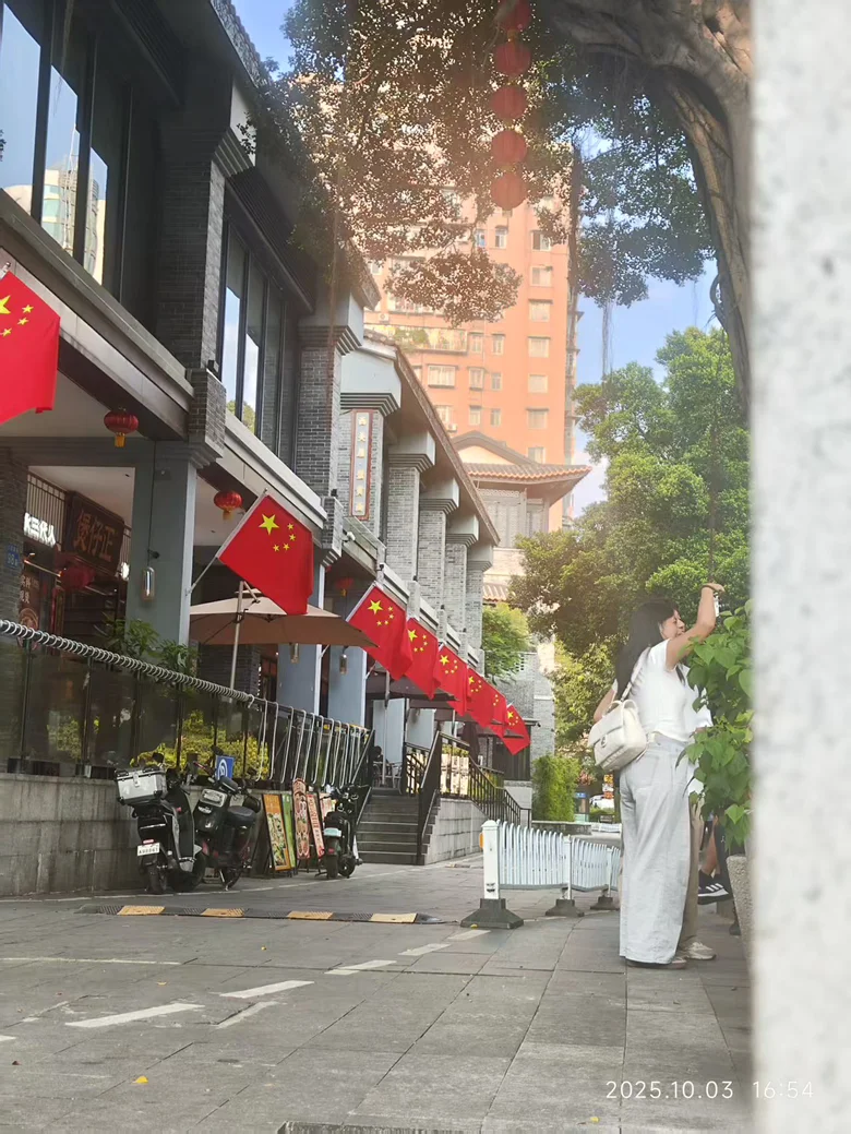前面两天腻了这人从众的热闹,偶尔也喜欢待在平静的大树下发呆。三号这天,荔枝湾的老榕树把阳光筛得细细的,洒在青石板路上,像撒了把碎金。“荔枝湾”的巨石前,游人或驻足默念,或笑闹而过,恍惚间竟有“偷得浮生半日闲”的悠然。路过泮溪酒家,独自观赏这青砖灰瓦上,红灯笼与国旗相映成趣,老字号的早茶香气悠悠飘来,难怪古人会写“人间烟火气,最抚凡人心”。沿街骑楼间,五星红旗猎猎作响,老铺木招牌的斑驳与新潮橱窗的明亮交织,恰似“新妆宜面下朱楼”的古今碰撞,让广州的生长脉络看得真切。