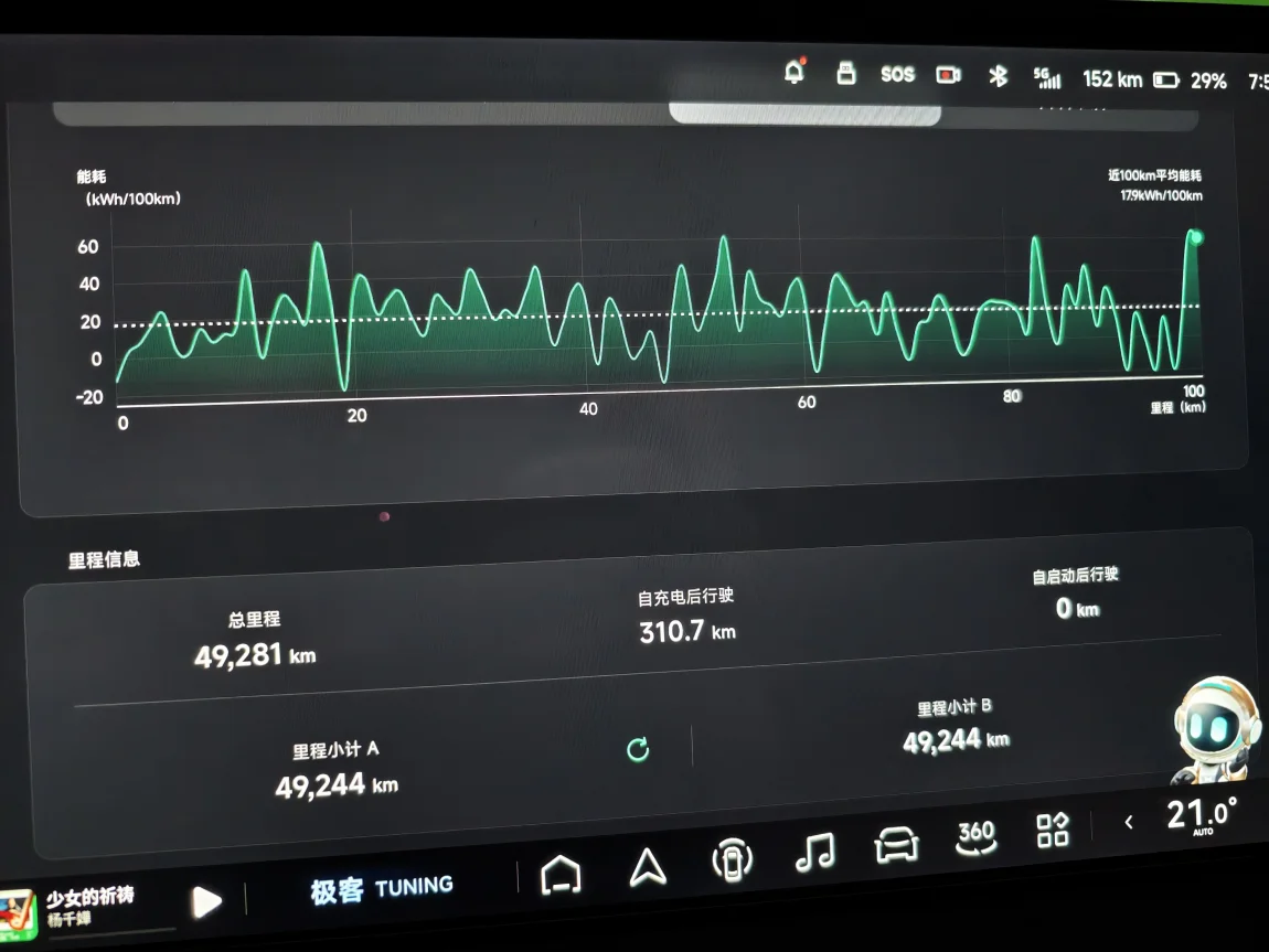 这次出行,一共走了310公里,走完剩下152公里,95%满电是494公里,折算下来,90%以上的续航达成率,你的续航焦虑还在那里?更值得深究的还是那个百公里能耗,四驱版的直接干到了18kWh以下!