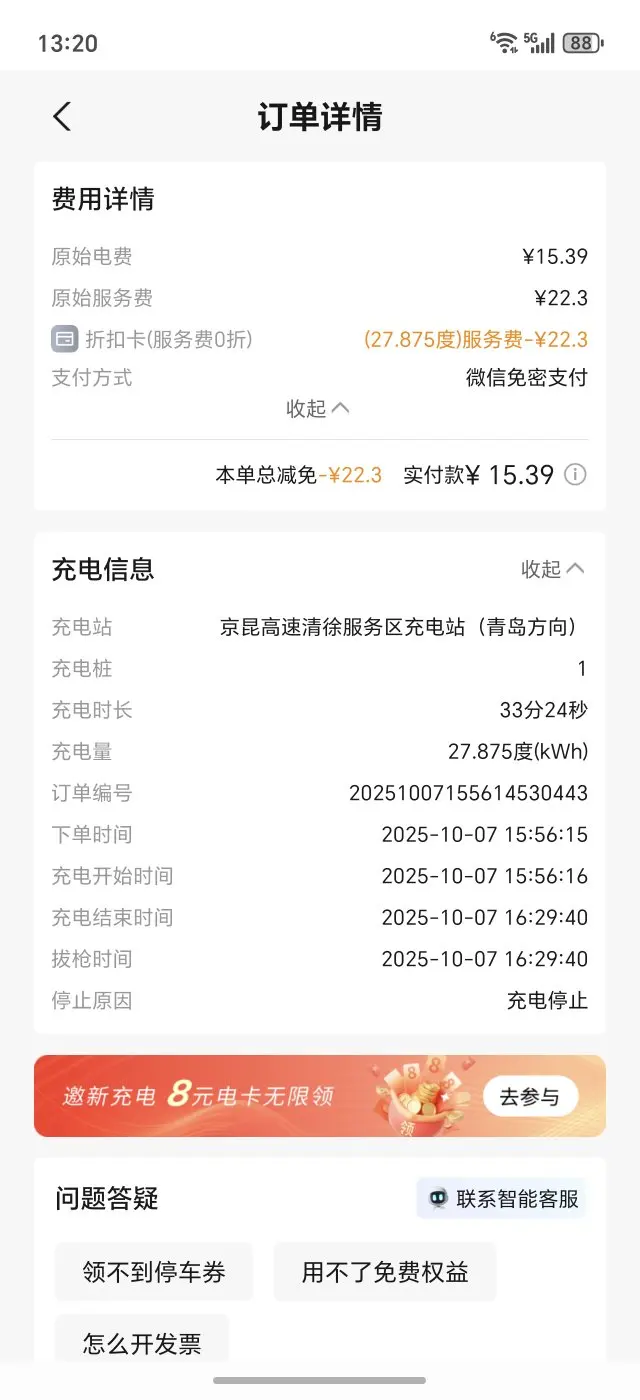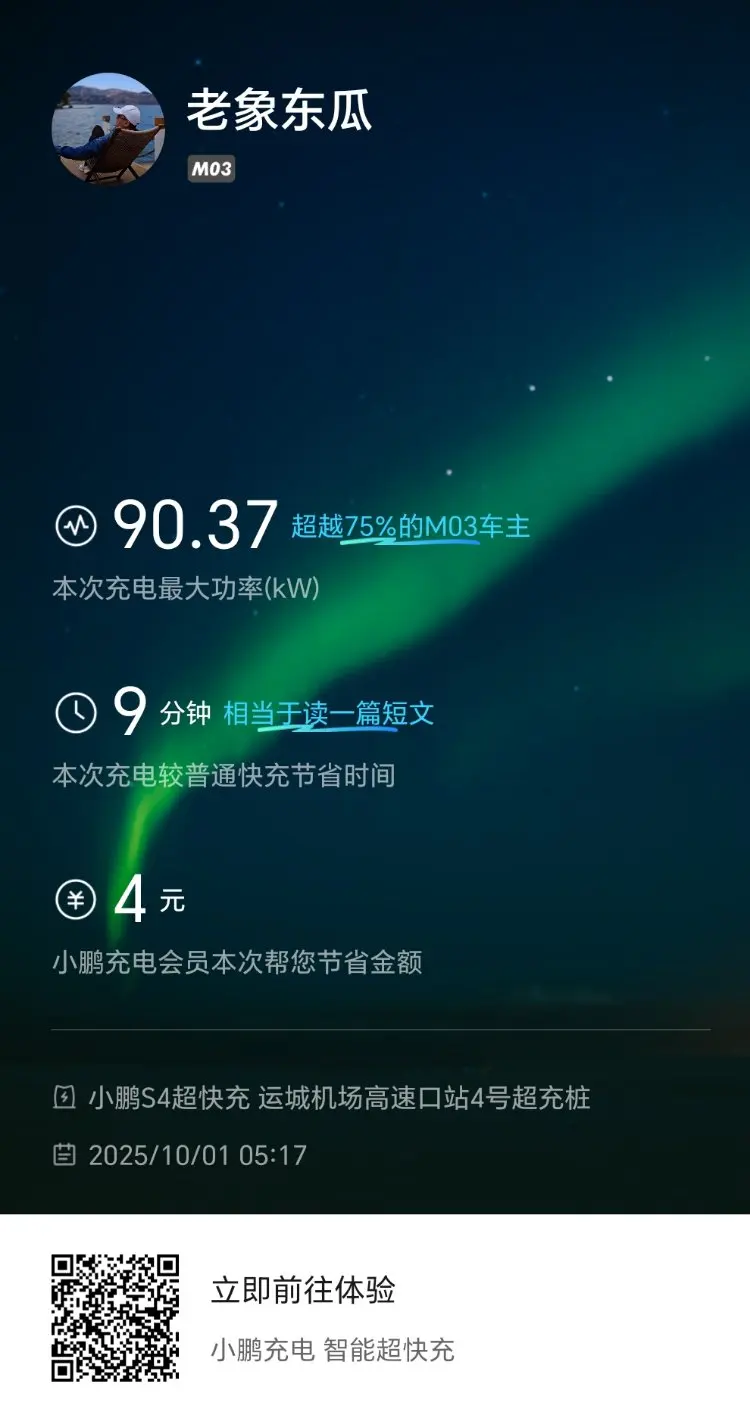 #满电黄金周,山河任我游# @鹏友俱乐部 @充电小助手 这次国庆赶上中秋传统节日,必须回老家和家人一起,早早就规划好行程,先去接上在太原上大学的侄女,正好附近有个小鹏充电站,而且离高速口很近,晚上充满电正好12点上高速,然后到运城高速口又是在小鹏充电站充电,下雨有顶棚,就在一下高速不远的地方,自营充电桩就是快,而且很方便!回来时赶时间直接在高速,有小鹏送的66度免服务费额度,一下省了好多